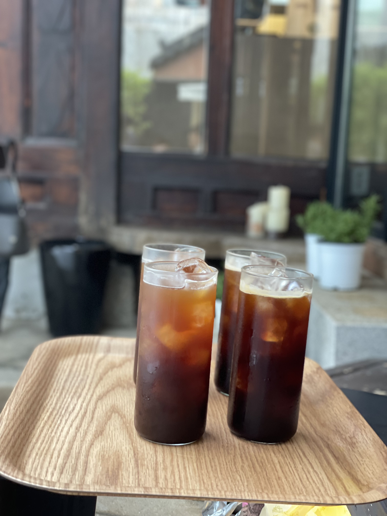 우리는 파전과 닭도리탕을 먹었고 맥주를 마시고 오랜 시간 걸었기에 아아를 먹기로 결정했다. 네 개의 아아를 시키고 크로플을 주문했다.