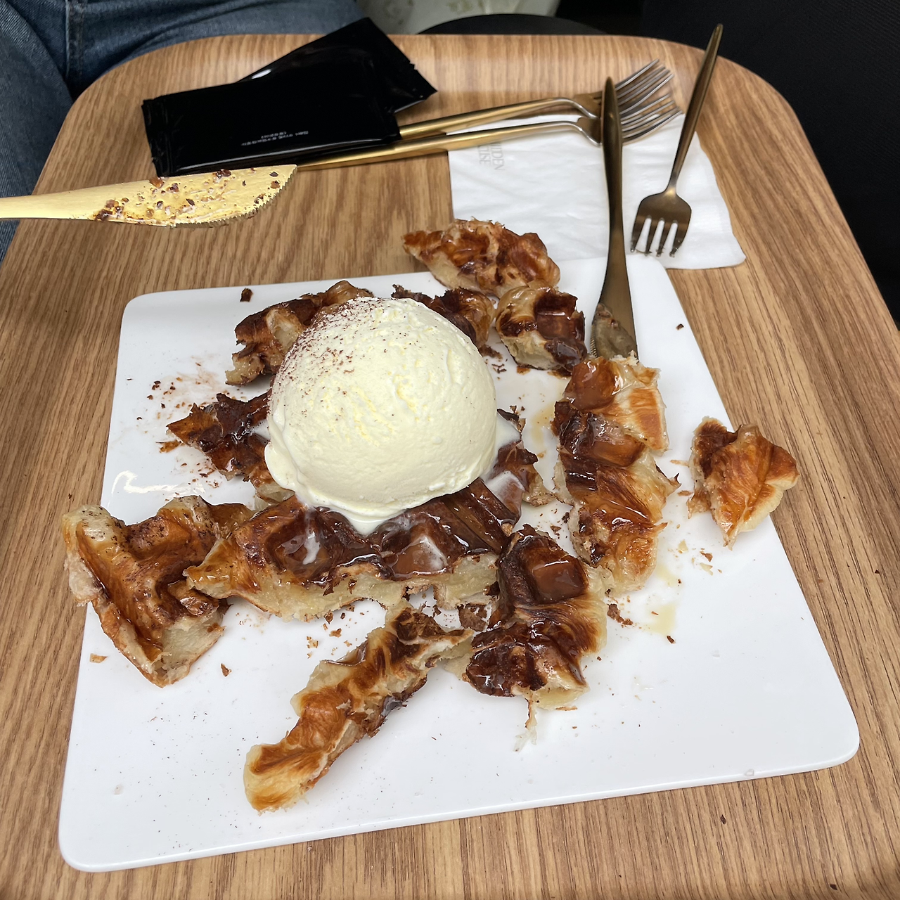 그 전까지 배가 부르고 부르다며 노래를 부르던 우리였는데 크로플은 나오자마자 사진을 찍을 새도 없이 조각 나 우리의 뱃속으로 사라졌다.