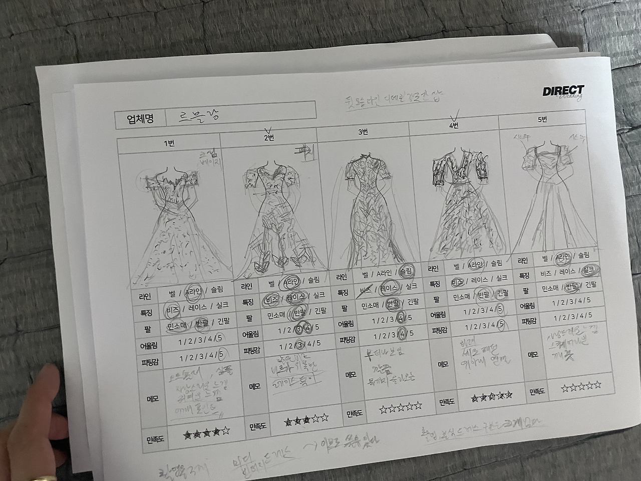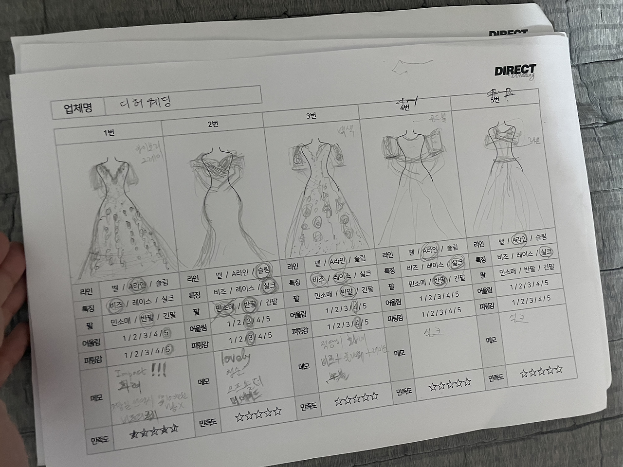 우리 셋은 각자 역할을 맡았다. 나는 영상으로 우리의 반응을 메모했고 동생의 남편은 그림스케치를 가져와서 거기에 평점과 느낌, 별점, 디테일 등을 기록했다. 엄마는 보자마자 10초. ‘신부 예쁘네’하는 데 걸린다는 그 10초의 시간을 온전히 느껴 드레스를 골라보기로 했다.