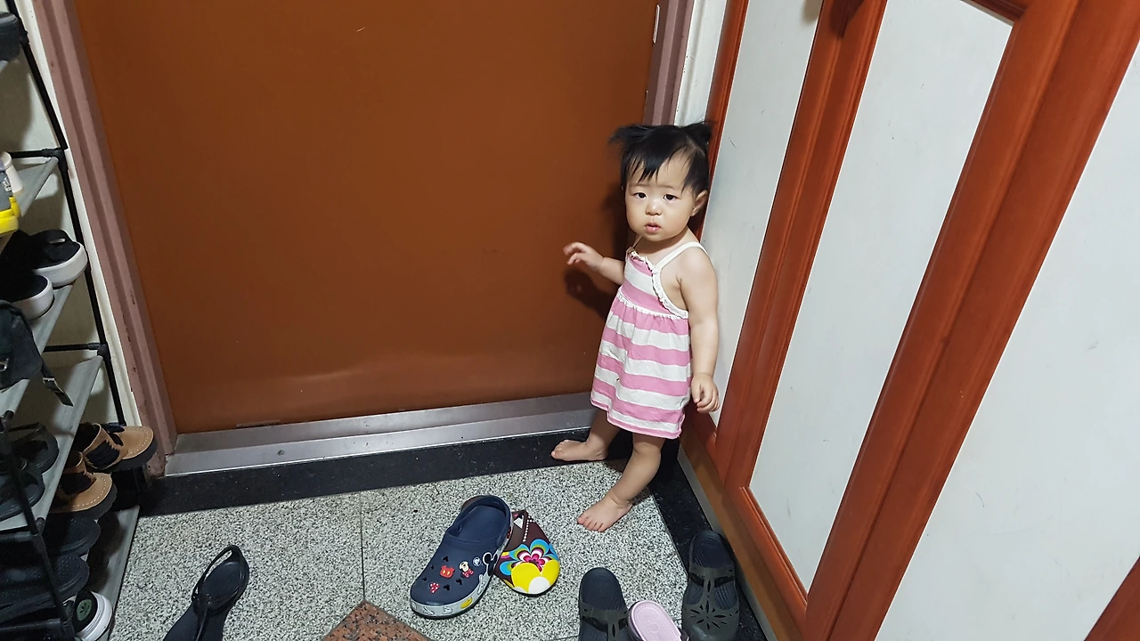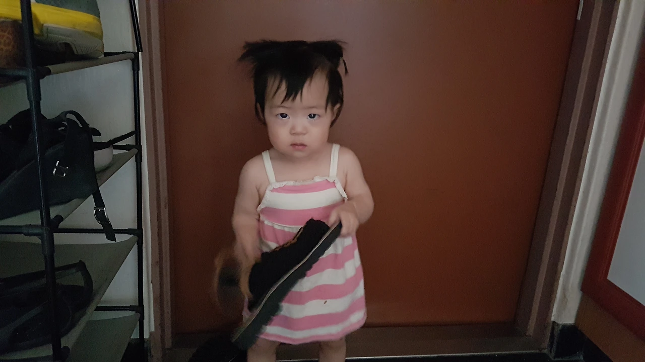머리는 산발을 하고 엄마 보고 싶다며 현관에 서서 신발을 잡고있는 귀여운 모습. 아빠가 안마기 하는 모습이 좋아보였는지 자기도 편안히 앉아 안마받는 모습.
