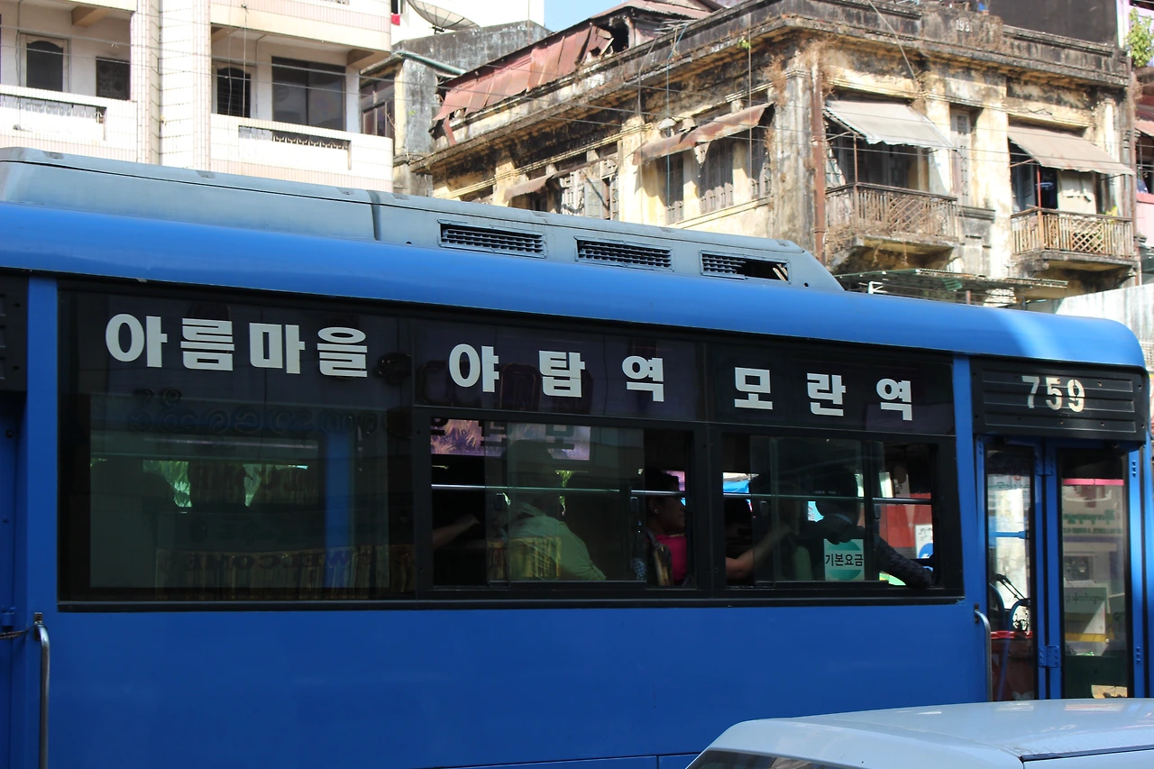 파란색 759번 버스의 창에는 ‘아름마을, 야탑역, 모란역’이라고 선명하게 쓰여 있다. 우리 나라 버스를 미얀마의 수도 한복판에서 보게 되다니!! 차량 앞뒤에 미얀마 글자가 자그마하게 적혀 있긴 하지만 차량 옆 창문 위에는 우리나라에서 도색한 그대로 한글로 적혀진 행선지가 남아있다.