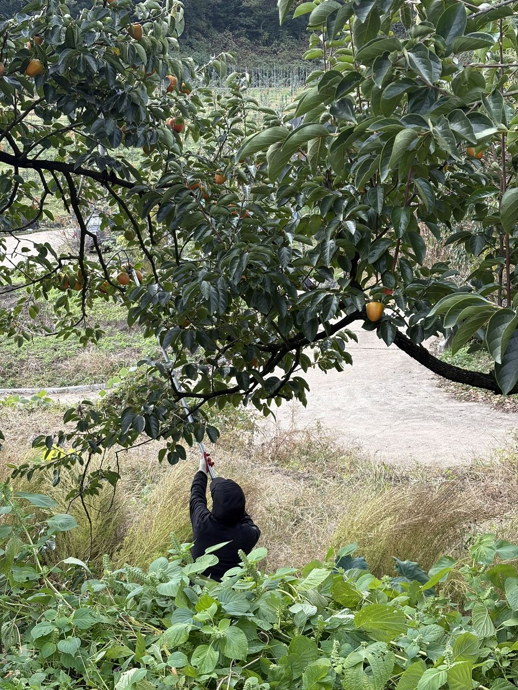 나는 주로 다리에 많이 물렸는데 의식을 하니 더 간지럽기 시작했다. 최대한 다리의 감각을 잊고 감 따기에 집중했다. 감나무를 따는 장비에는 두 가지가 있었다. 가위처럼 똑하고 자를 수 있는 것과 신발주머니 같은 주머니가 달려있어 감이 쏙 하고 떨어지는 장비가 있었다.