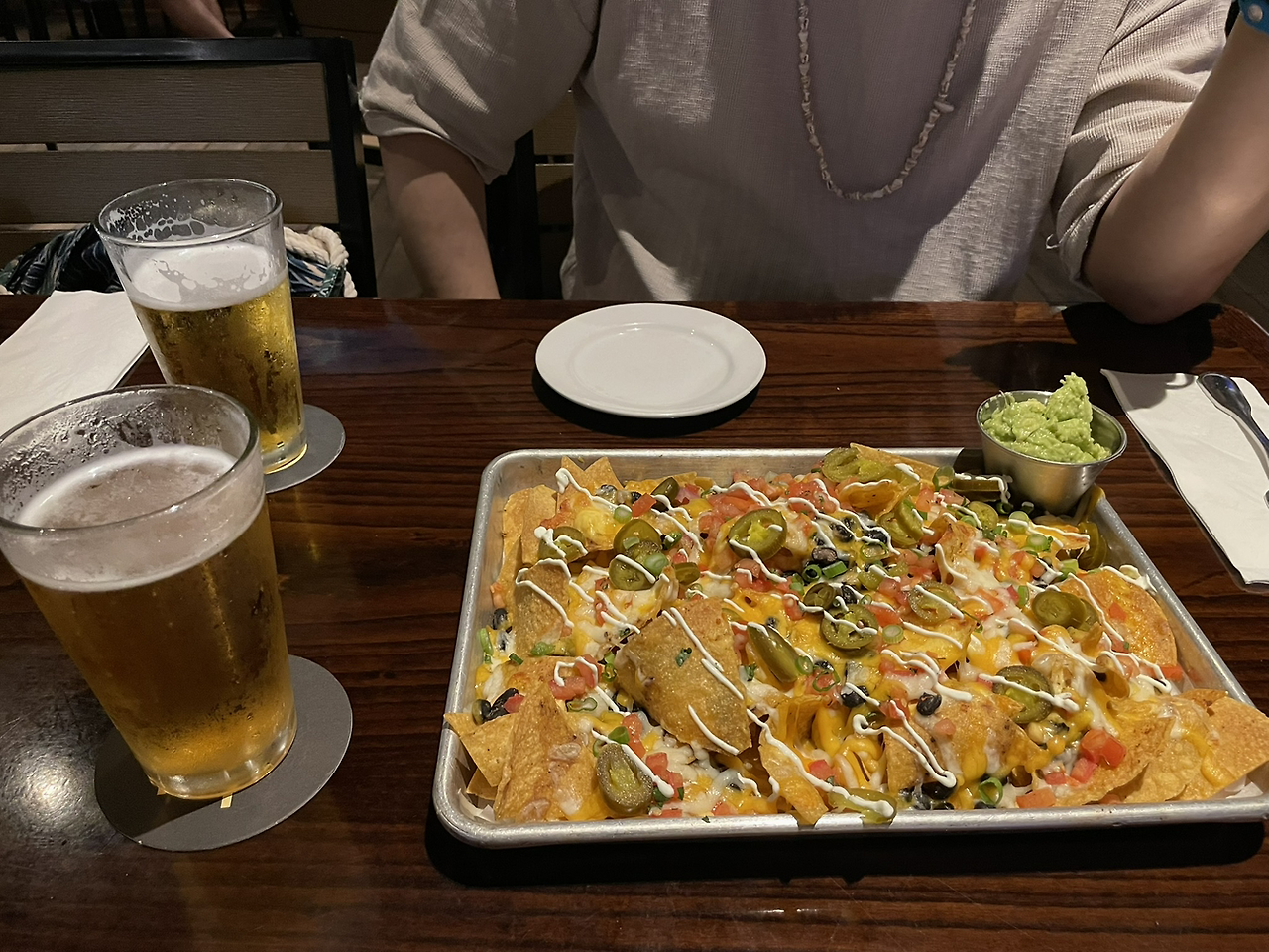 우리는 과카몰리를 추가한 나쵸칩과 시원한