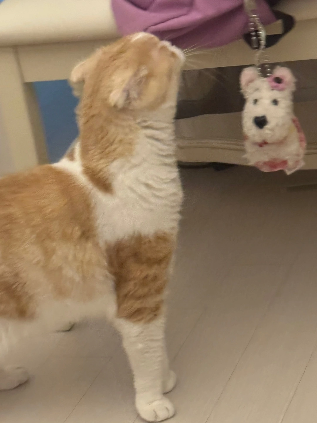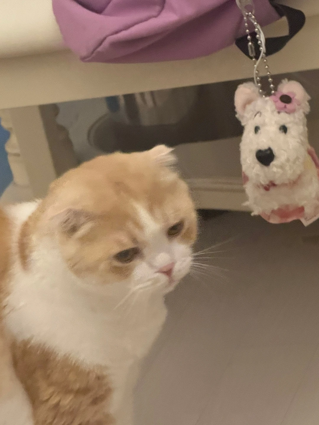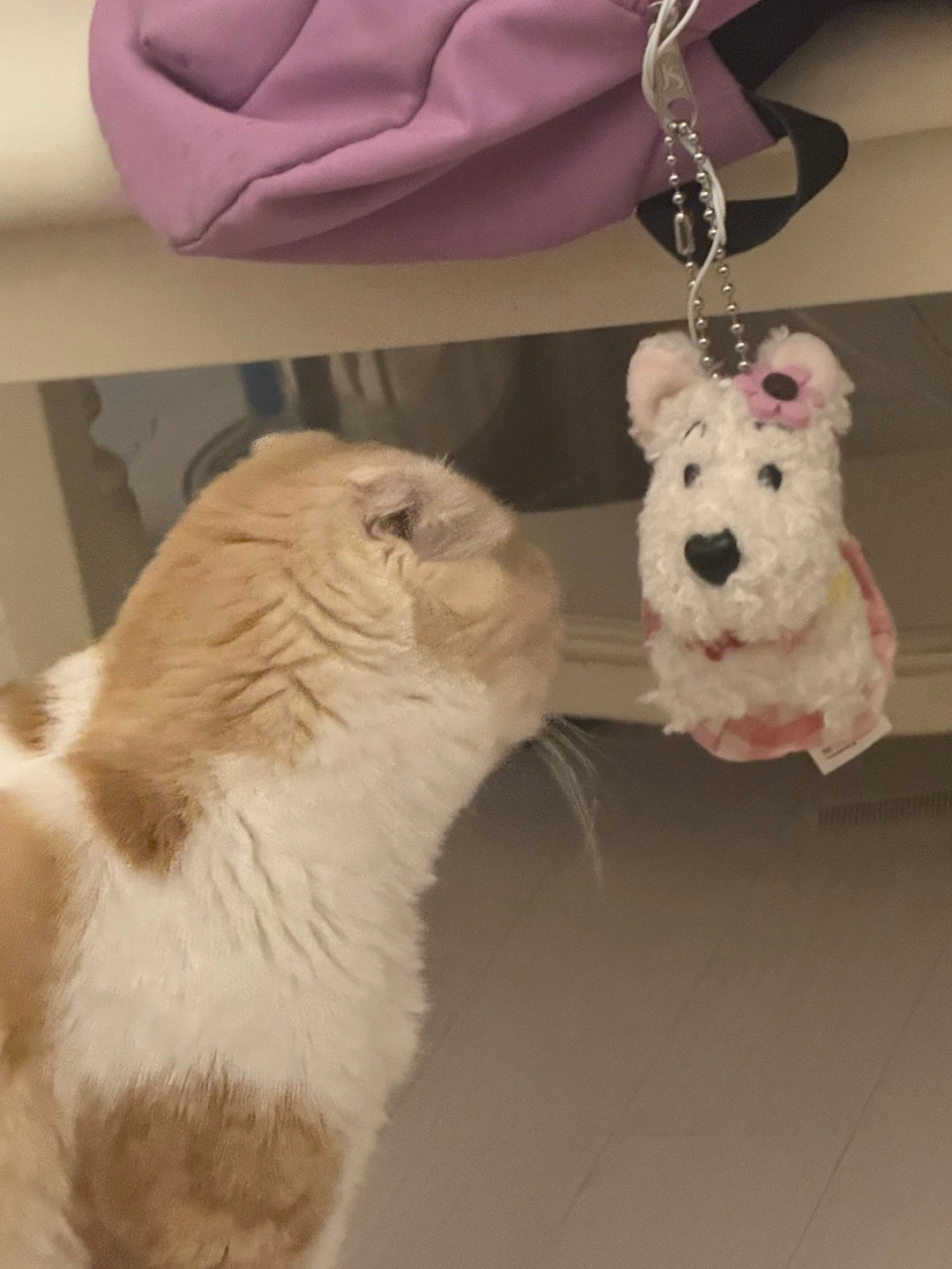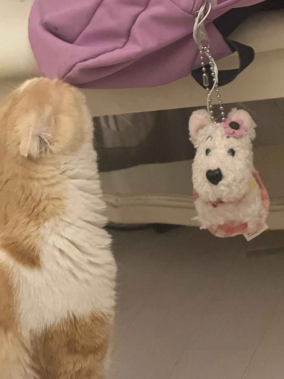 어느 날은 누나가 가방에 달고 온 작은 강아지 인형이 피터의 관심을 끌었다.
