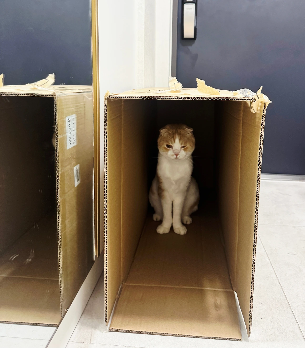 온 집안을 자기 놀이터로 쓰면서도 새로운 박스만 오면 꼭 자기 땅 도장 찍듯 들어가는 걸 보면,