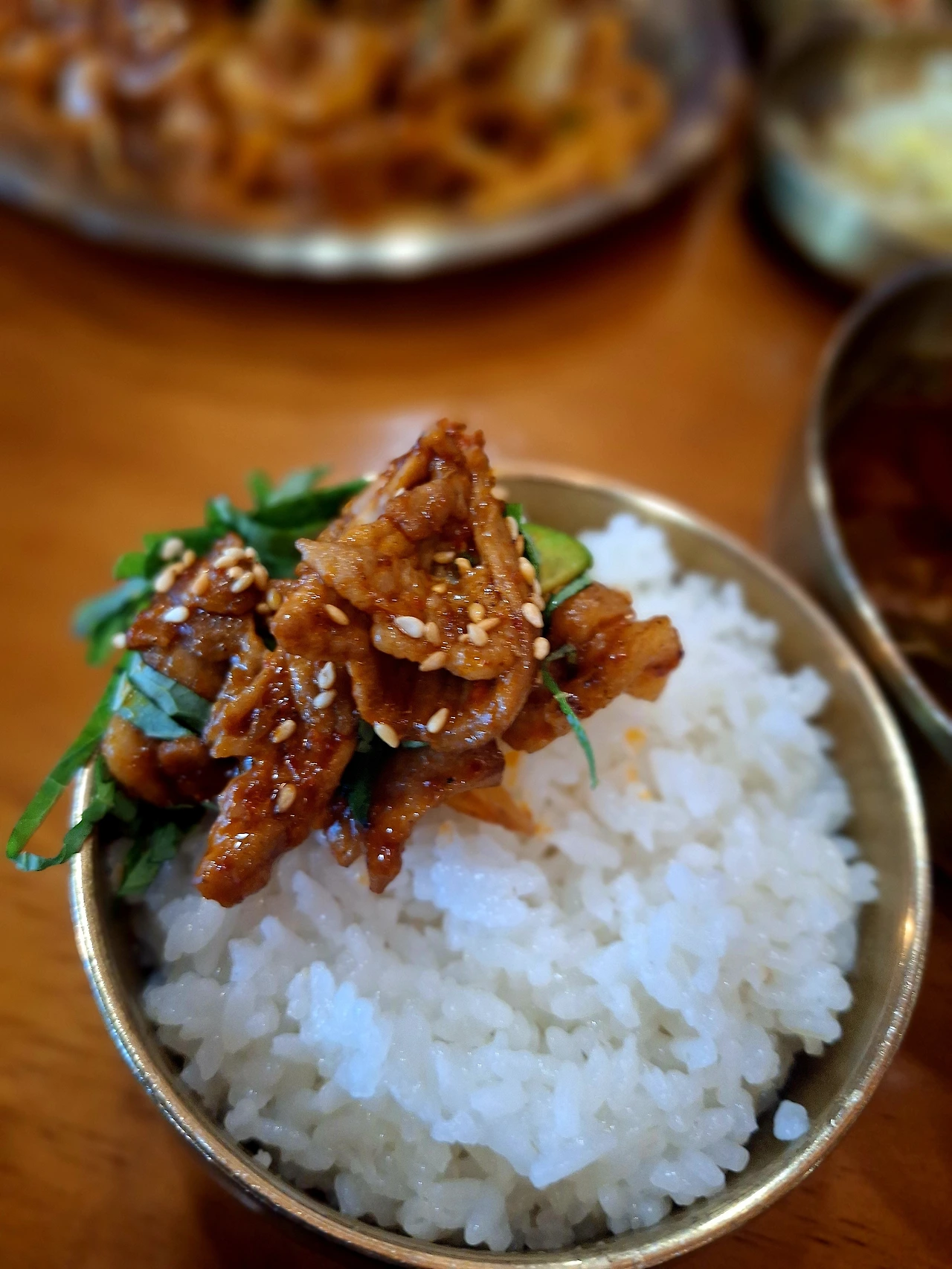 하얀 쌀밥 위에 윤기 자르르한 제육 한 점을 크게 올려