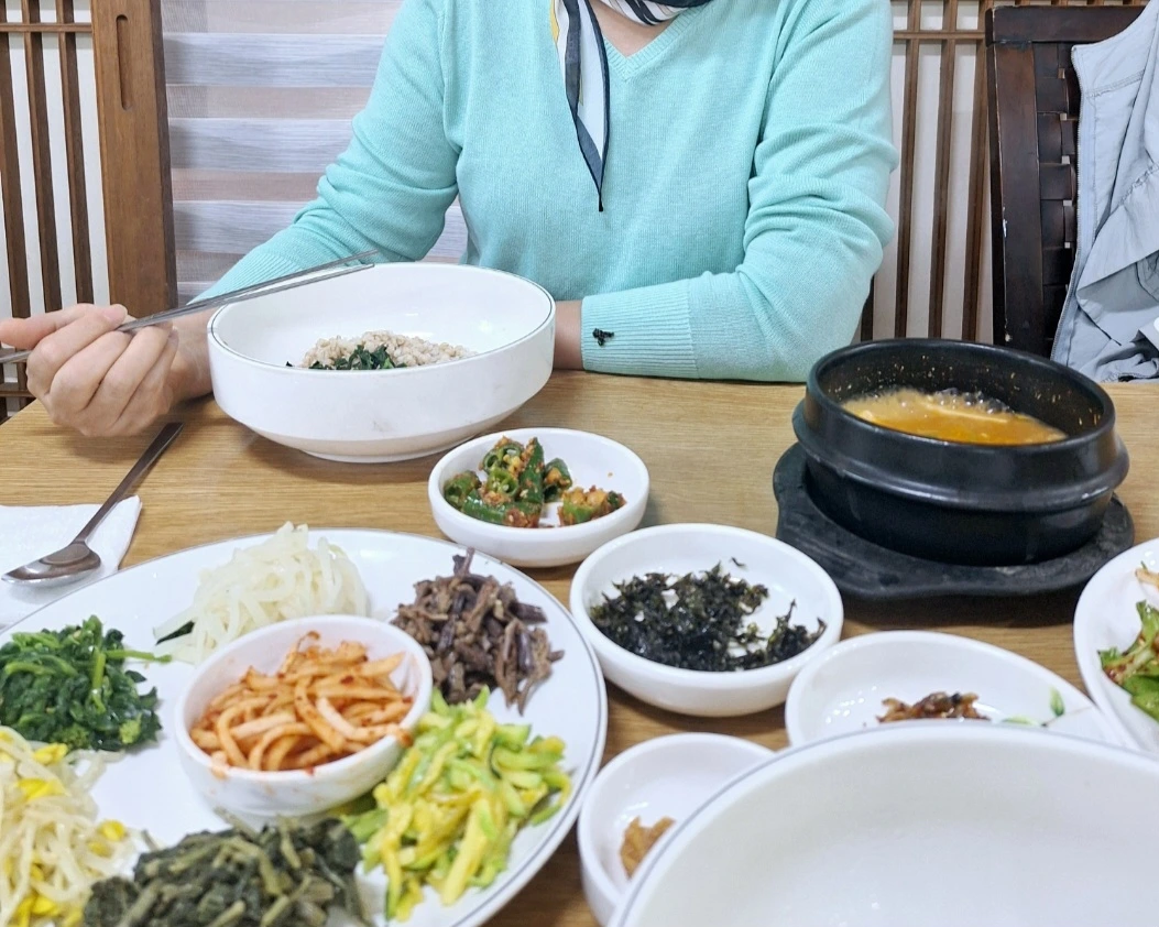 보리비빔밥과 도토리묵 한 접시를 놓고 마주한 점심식사