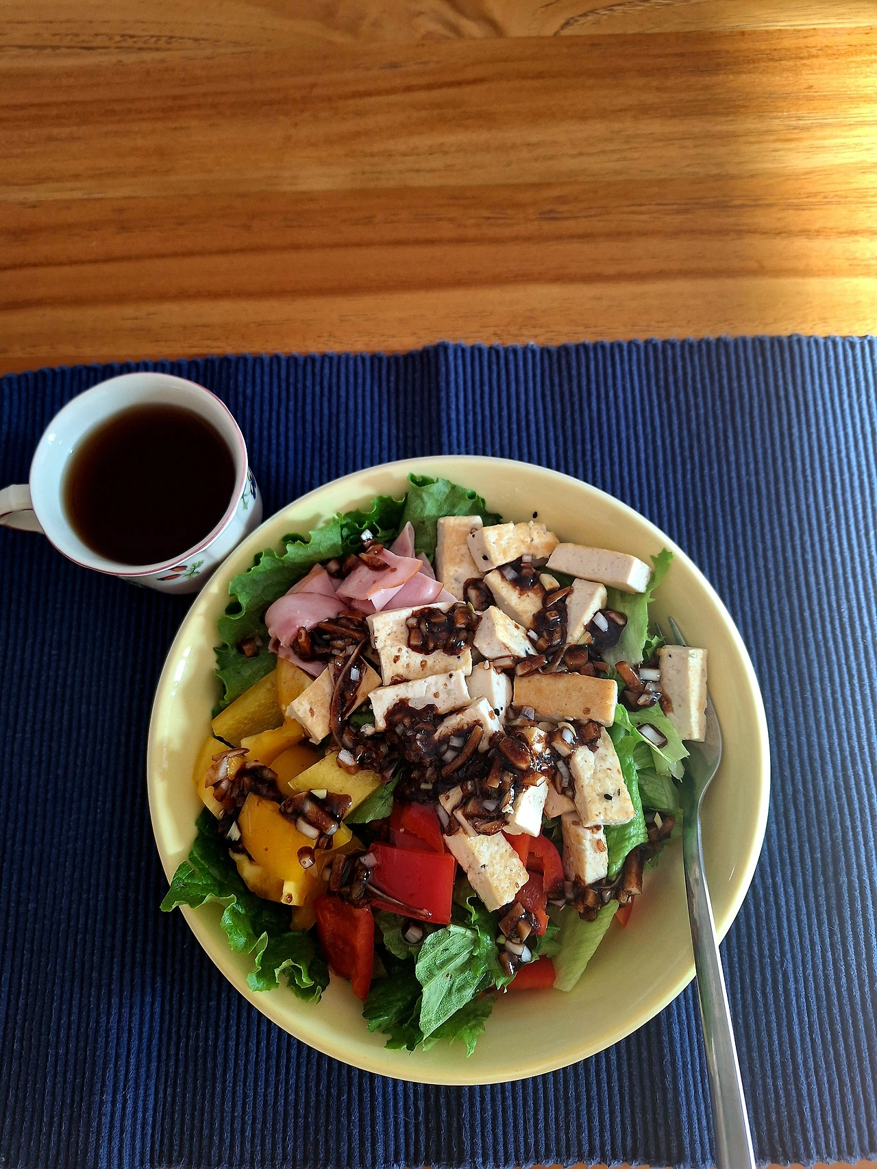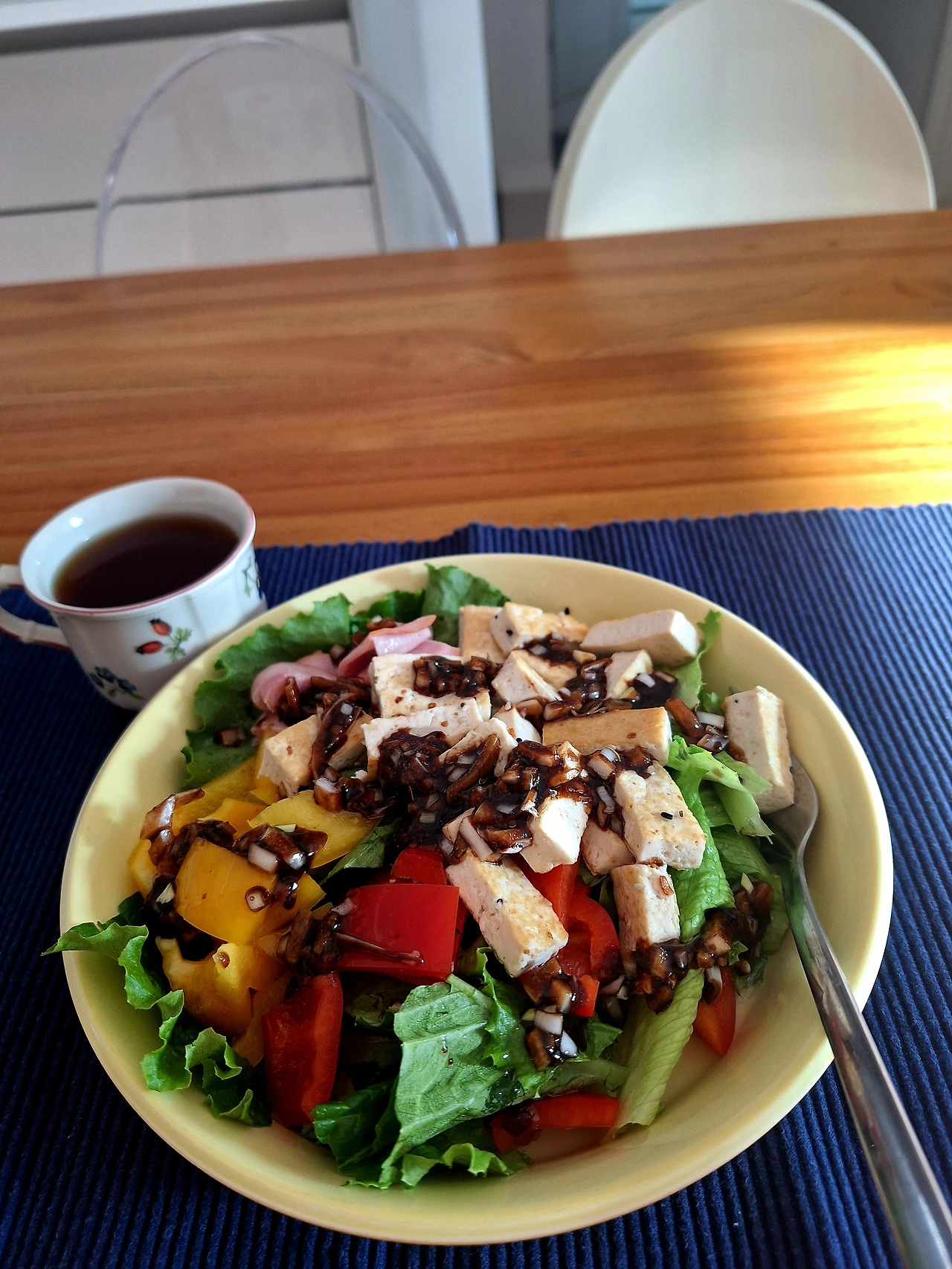 아침 겸 점심으로 두부를 잘게 썰어 바삭하게 굽고, 야채샐러드에 살포시 얹은 후 발사믹아보카도 오일을 뿌려 커피 한 잔과 시작하는 혼자만의 브런치!