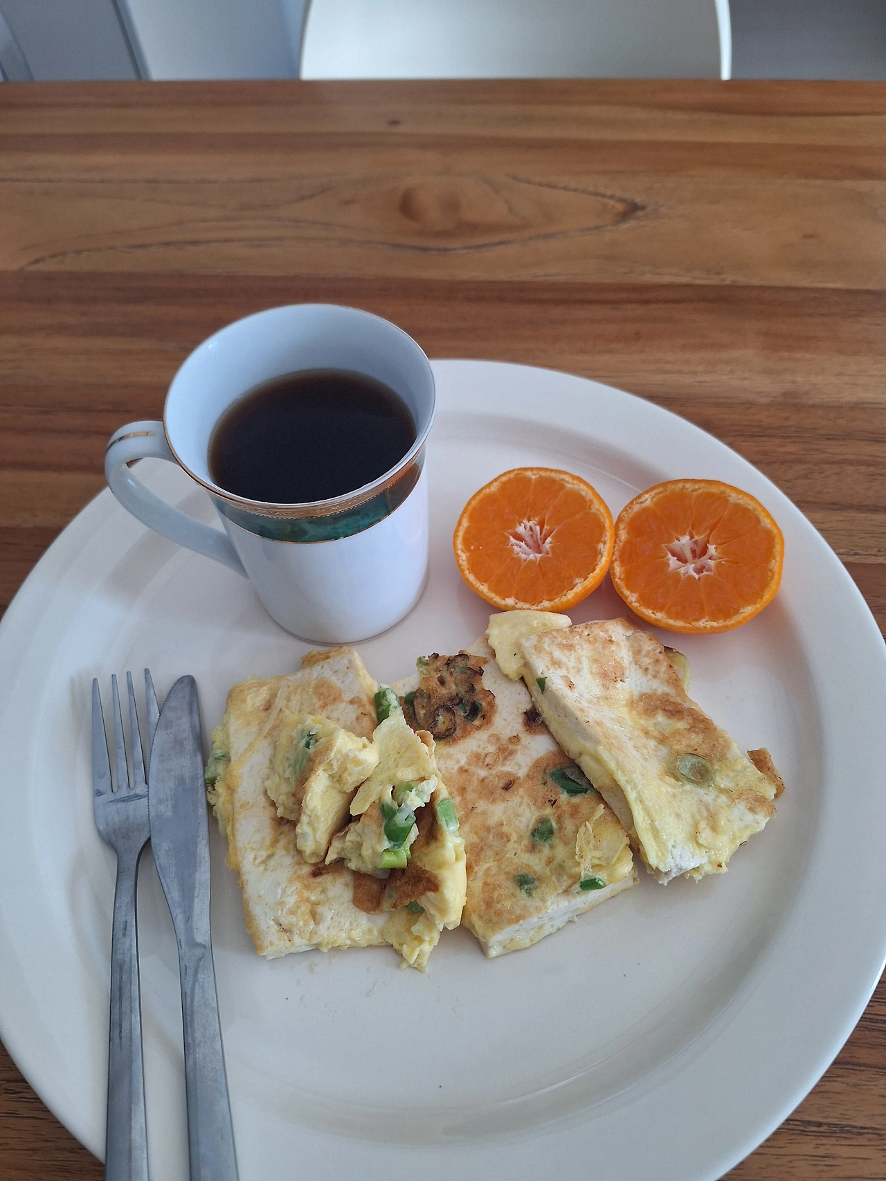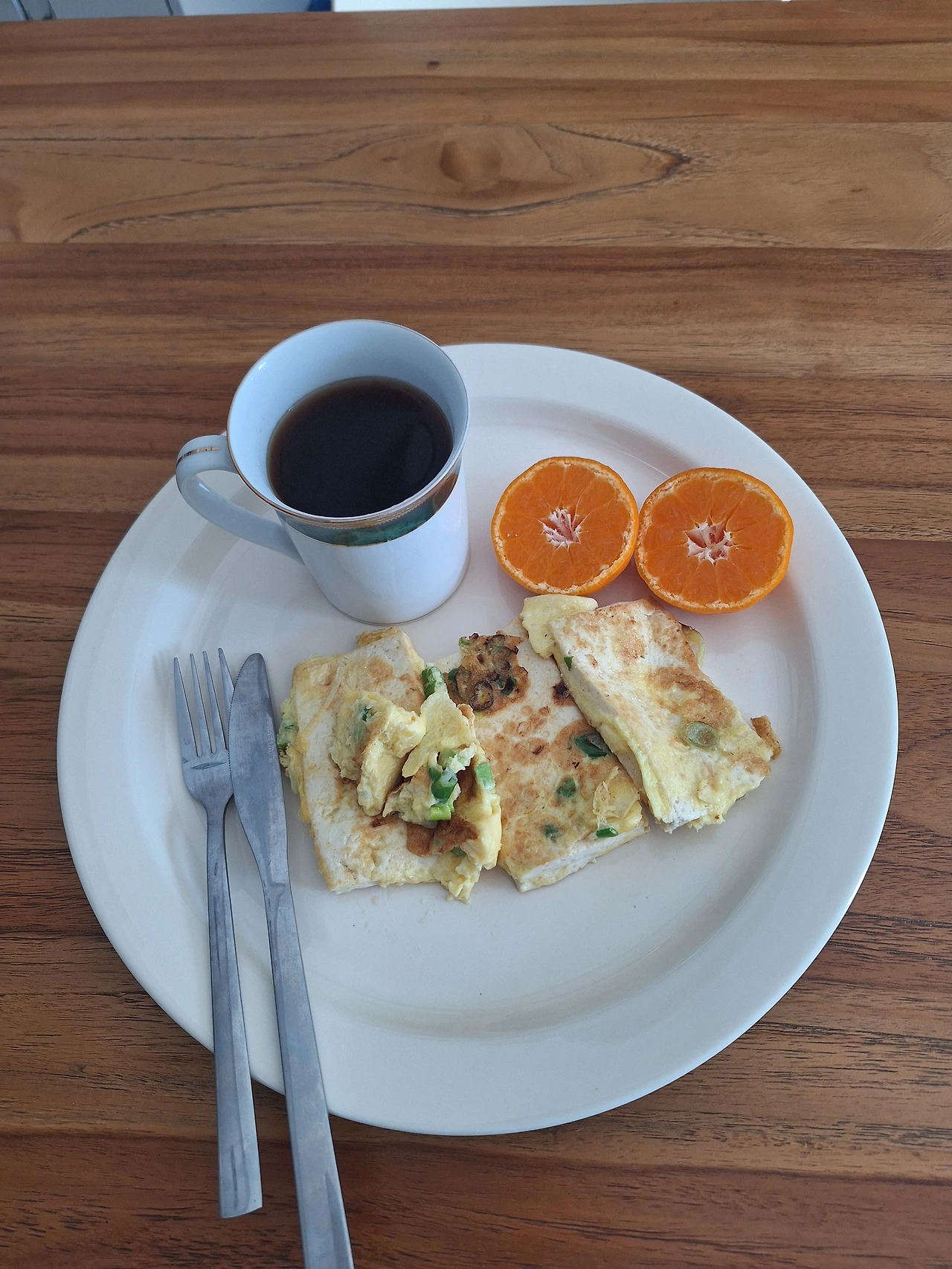 간단히 커피 한잔 내리고 두부에 계란을 입혀 들기름에 지글지글 구웠다.