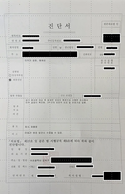 마음같아서는 바로 부산으로 달려가고 싶었지만 나는 일을 하고 있었고, 그리고 400km가 넘는곳을 단순히 궁금하다고 갔다올 수 있는 상황은 아니였기에 인터넷으로 알아보기로 했다. 진단서에는 환자의 인적사항, 주소 , 전화번호 , 그리고 병원의 이름, 주소, 의사이름 등등 왠만한 인적사항은 다 나와있다.