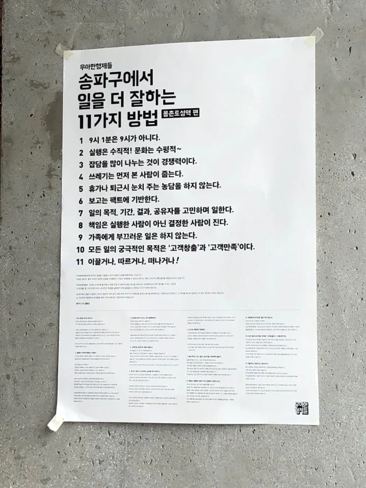 문화는 문화고, 일은 일이죠. 한시가 바빠 죽겠는데 언제 저런 11가지 법칙을 정하고, 재치있게 써내려서, 디자인하고, 인쇄해서 회사 벽에 붙이고 다녀요. 그냥 슬랙 공지사항으로 대표님이 한 마디 하시면 되잖아요.