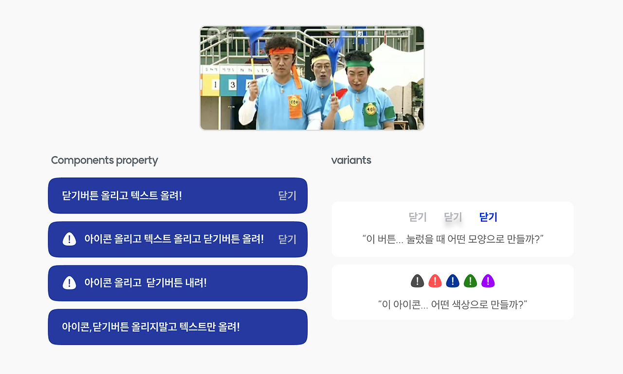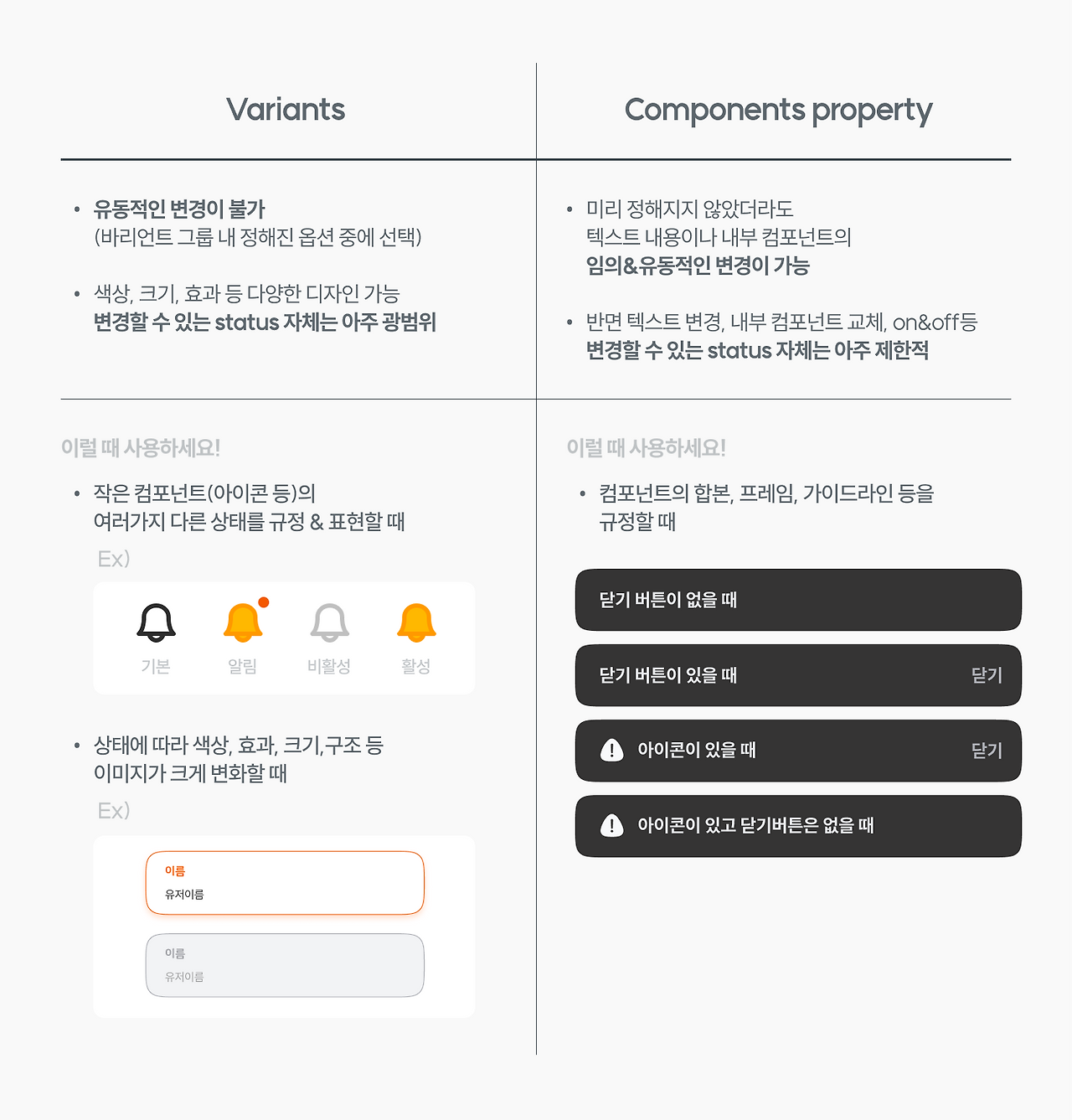 물론 두 기능 중 하나만 써야하는 것은 아니기 때문에, 먼저 컴포넌트 프로퍼티를 적용한 컴포넌트를 만들고, 해당 컴포넌트를 이용해 색상이나 효과를 적용한 바리언트를 만들면 더욱 다채로운 형태의 컴포넌트 활용이 가능할 듯 합니다. (즉, 바리언트를 만들어 새로운 색상이나 효과를 반영하더라도, 기존 컴포넌트 프로퍼티 시스템은 계속 유지된다는 뜻!)