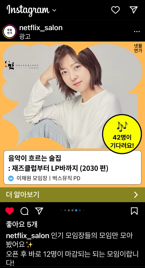 그리고 정기적인 관계를 쌓아갈 수 있는 형태의 모임을 할 수는 없을까?라는 생각이 들면서, 눈여겨보던 국내 최대 모임 플랫폼인 <넷플연가>에 모임장 지원을 했다. 지원과 면접이라는 투명한 프로세스를 거쳐 2023년 초에 모임장이 되었다. 그리고 내가 기획한 첫 모임을 열었는데, 모객이 안 되어 잠시 소강상태였다. 당시 넷플연가의 직원 분과 열심히 소통하며 보완해 보고, 다른 콘셉트의 모임을 기획해서 열었는데 쉽지 않았다... 그렇게 약간의 좌절을 겪고(크게는 아니었다) 다시 기회가 찾아왔다. 넷플연가에서 기획한 <음악이 흐르는 공간> 시리즈의 한 모임장을 맡게 된 것이다.