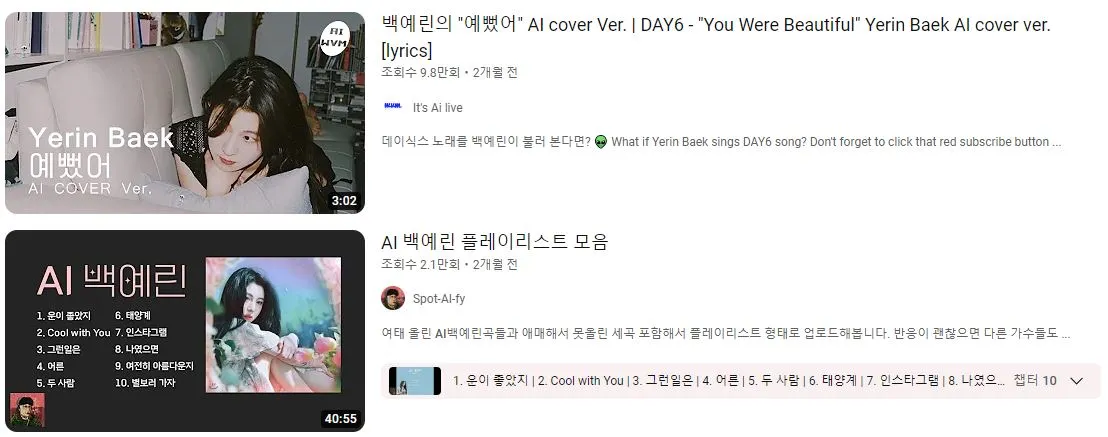 이 정도의 음원이야 팬들의 관심, 니즈라고 볼 수도 있지만 해외에서는 AI로 만든 노래를 스포티파이에 등록해서 실제 문제가 발생한 적도 있었다. 4월에는 Drake와 Weeknd의 컬래버레이션 곡이 생성형 AI로 합성한 가짜로 판명되면서 스포티파이와 애플뮤직 등 음원 플랫폼에서 나흘 만에 삭제되기도 했다. 앞으로 음악 분야에서는 이런 저작권 관련한 이슈가 지속해서 생기지 않을까 싶다.