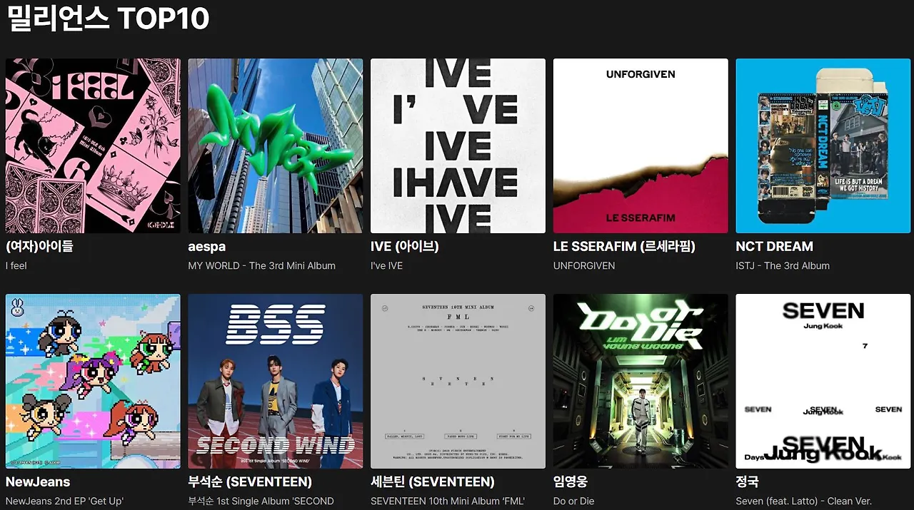 NewJeans, IVE, 르세라핌을 필두로 단연 여자 아이돌의 활약이 돋보이는 한 해였다. MMA에서는 멜론 데이터 기준으로 10개의 앨범을 선정했는데, (그러다 보니 K-pop 위주긴 하지만)이 중 절반이 걸그룹이다.