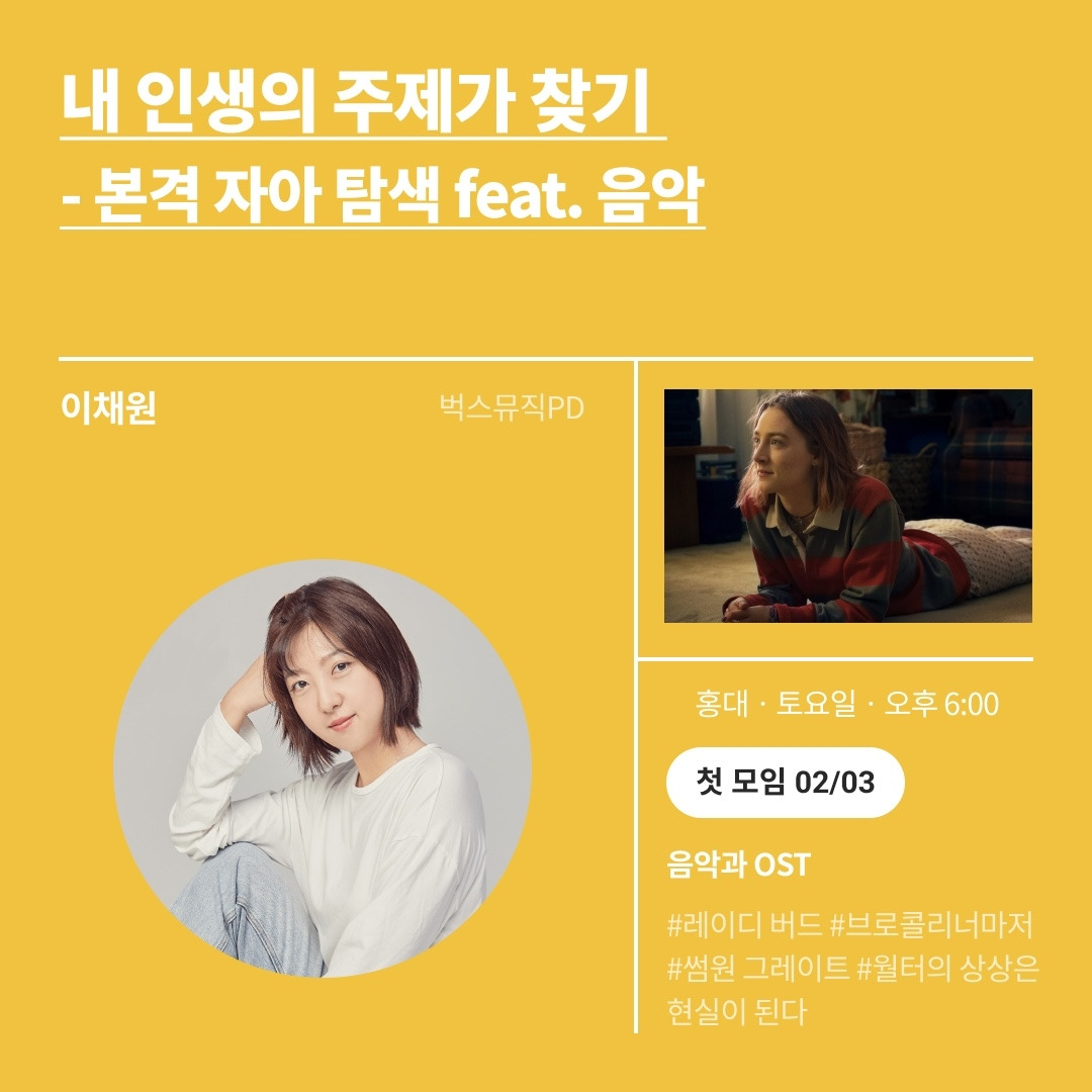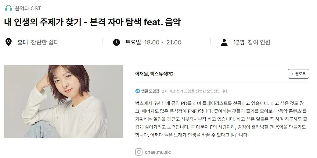 그러나 나만의 고유한 모임에 대한 욕구가 존재했고, 그래서 '내 인생의 주제가 찾기 - 본격 자아탐색 (feat. 음악)'라는 모임을 기획했다.