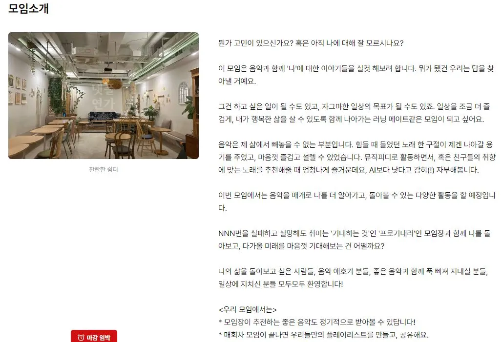진행하면서 여기에 두어 개의 목표가 더 추가되긴 했지만. 음악은 나의 아이덴티티와 같고 또 가장 자신 있는 분야이기에, 음악을 매개로 나를 탐색하는 여러 활동을 기획했다. 나름 실패도 많이 해보고, 나를 찾기 위한 노력을 게을리하지 않는 사람으로서 이 주제를 기획해 봤다. 음악모임이긴 하지만 그래도 '나'에 대한 이야기를 하는 모임이다. 쓰다 보니 느낀 건데, 나는 음악이 사람을 더 나은 방향으로 나아갈 수 있게 하는 힘이 있다고 믿는 것 같다. 내 모임장 소개에 적힌 것처럼, '어쩌다 들은 노래가 인생을 바꿀 수 있다'라고 믿는다. 그래서 사람들에게 긍정적인 영향을 주고 일상에서 활력소가 될 수 있는 모임을 만들고 싶었던 것 같다.