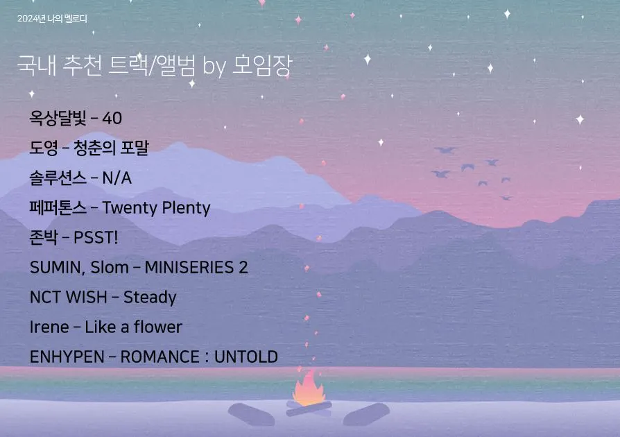 2024년 12월에도 2023년에 이어 넷플연가에서 음악 결산 이벤트를 진행했다. 12명의 멤버들과 이야기를 나누고, 준비했던 기록을 꺼내어 본다. 이로서 나의 2024년도 (진정한) 마감이다. 마무리하다 보니 2025년이 온 것은 함정이지만...