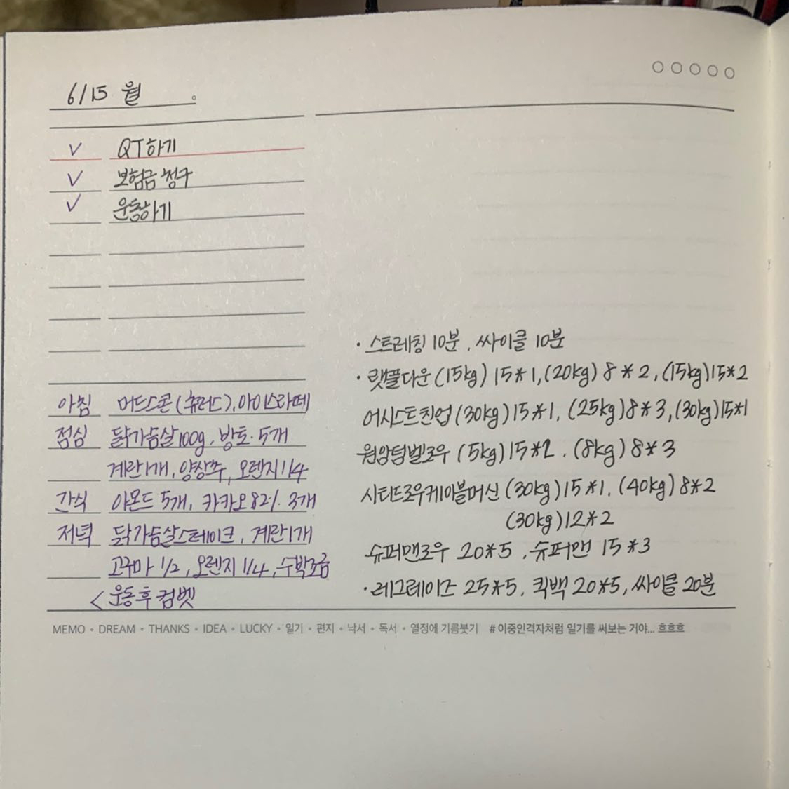 운동은 주 4일 웨이트 주 1일 유산소 정도 했다. 거의 매년 그렇게 했는데 대표님은 분할 운동을 추천해주셨다. 내가 주 5일 운동을 하니 그것에 맞추어서 등, 이두/ 가슴, 삼두/ 하체, 어깨/ 등, 가슴/ 하체, 어깨 이렇게 나누라고 하였고 한 부위를 주당 40세트를 할 수 있을 때까지 횟수도 늘리라고 했다. 오메 나 죽어!