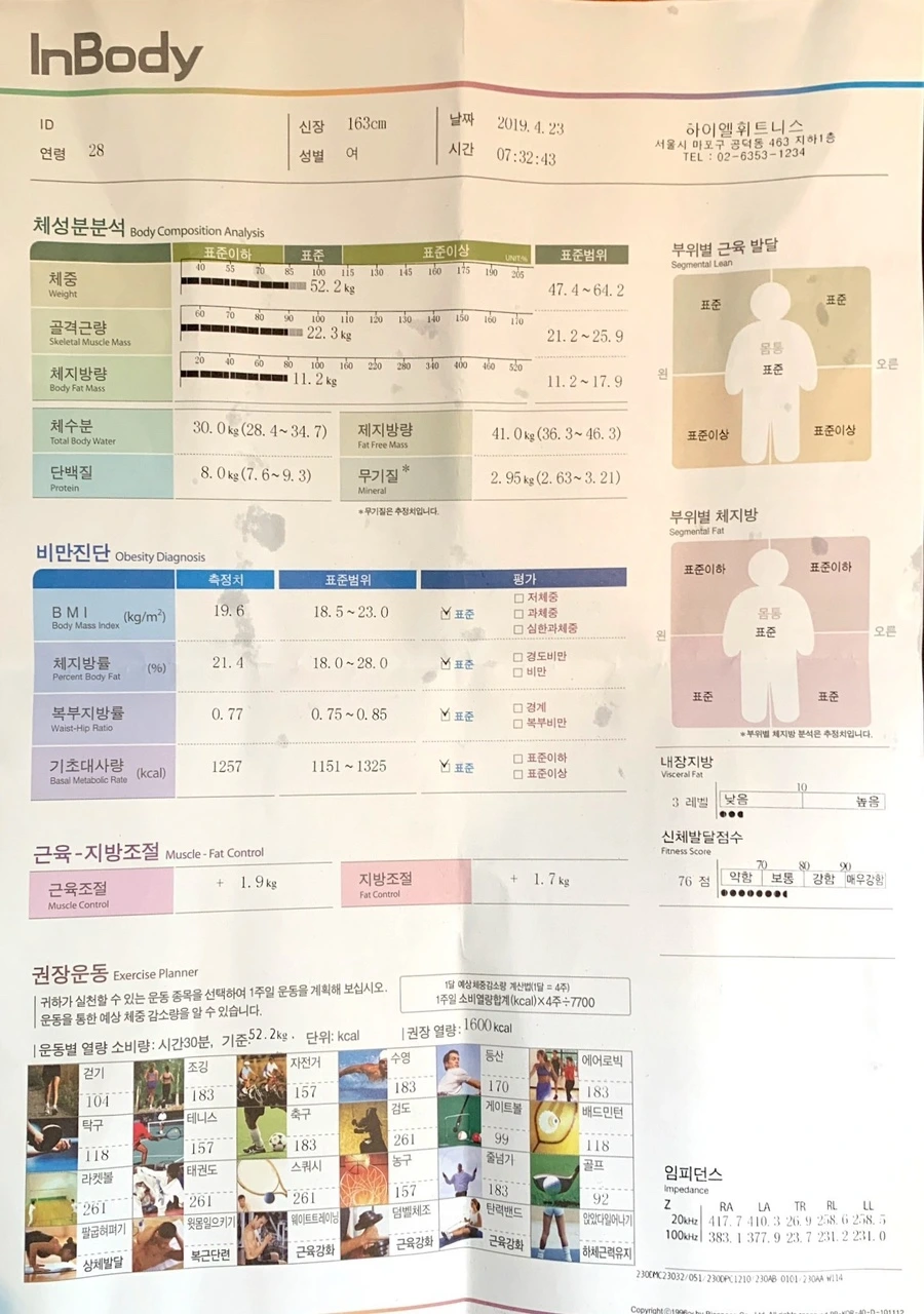 혼자 만들어본 가장 좋은 체성분 결과다. 세부 가겠다고 열심히 운동했을 때인데, 이때도 최선을 다했다 생각했지만, 지금 생각해보니 너무나 부족하고 참 오래 걸렸다. 그리고 더 이상 몸의 변화를 기대하긴 어려웠다.