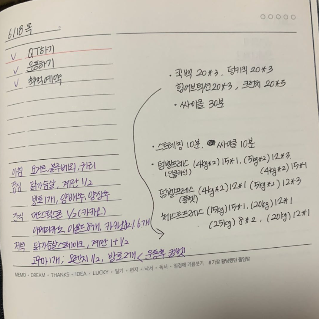 주 5일 운동이라 딱 한눈에 보기가 좋았다. 난 늘 꽉꽉 채워서 쓰는 걸 좋아해서 그런지 운동일지를 정말 기분 좋게 썼던 것 같다.