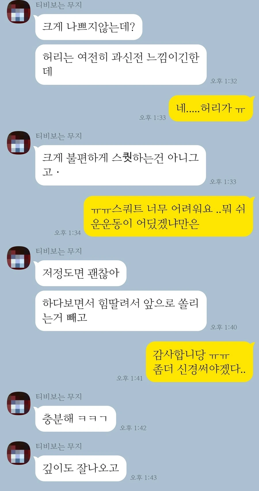 또 주변에 운동을 좋아하고 잘하는(헬창..?) 오빠들의 도움을 많이 얻었다. 내 운동 영상을 보내주고 조언과 팁을 얻었다. 부끄럼쟁이라 영상은 스쾃밖에 찍지 못했다. 다들 어떻게 운동 영상들을 찍는 건지... 난 여전히 운동 영상 찍는 게 부끄러운데....