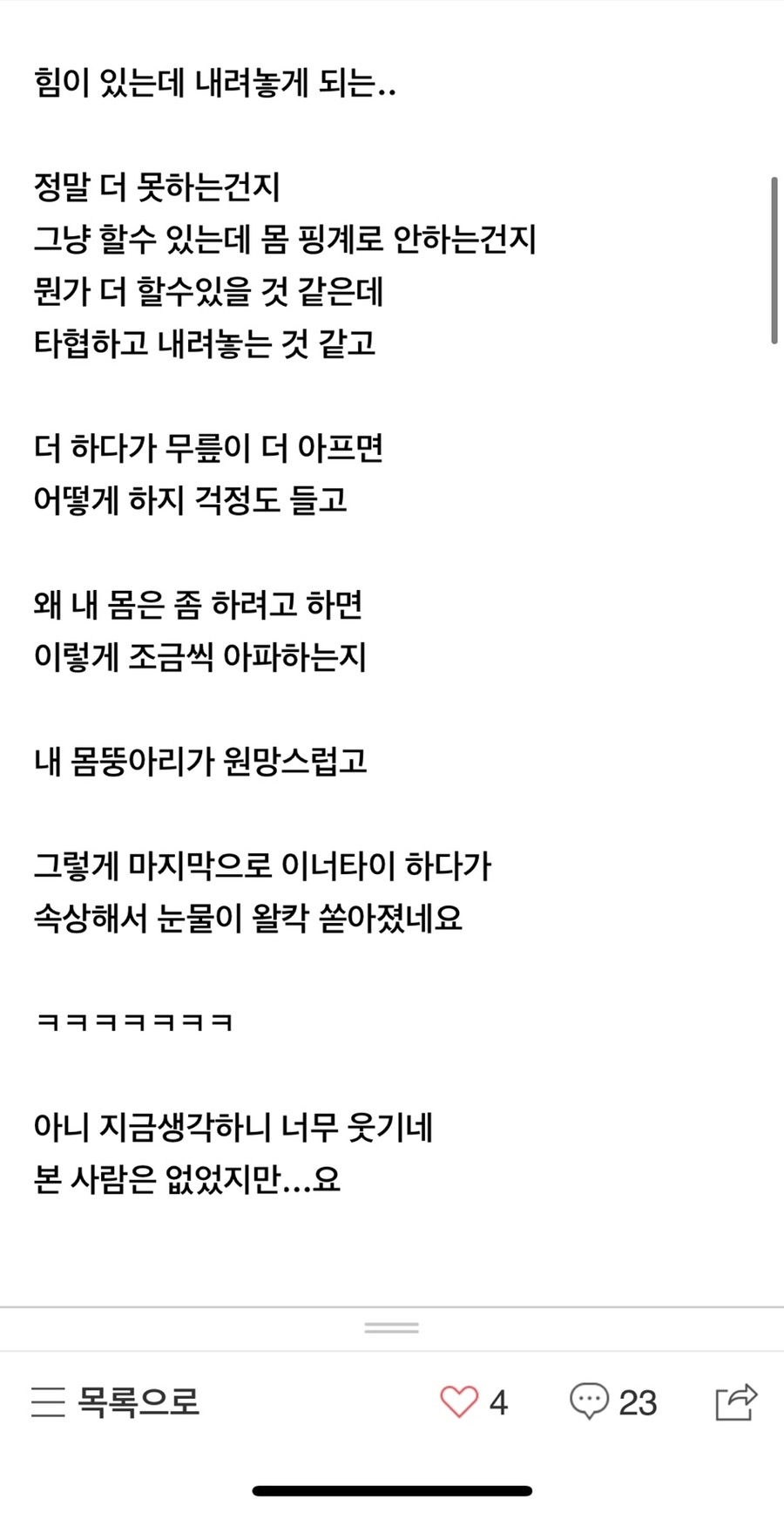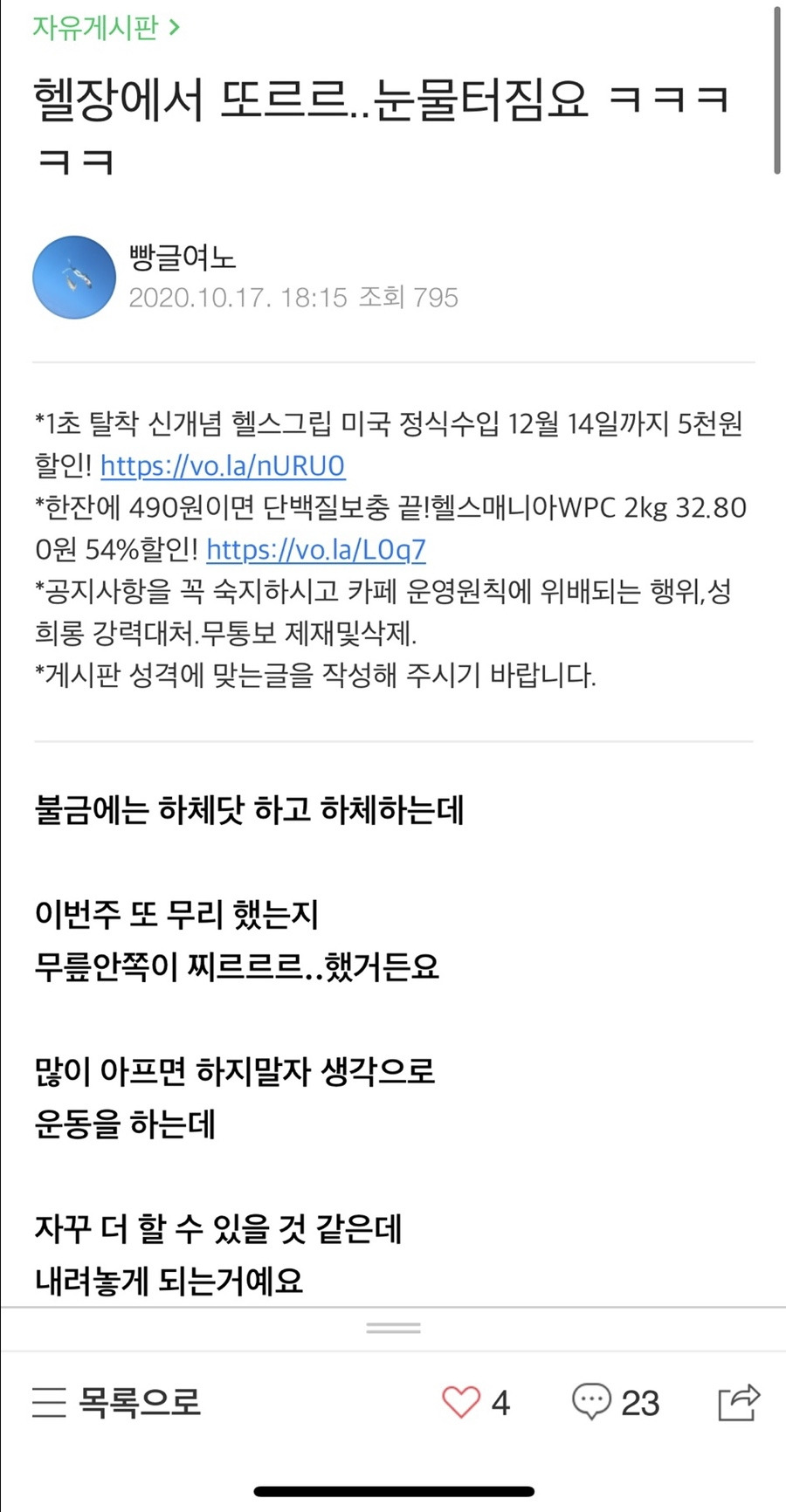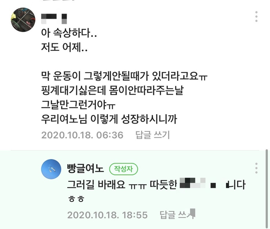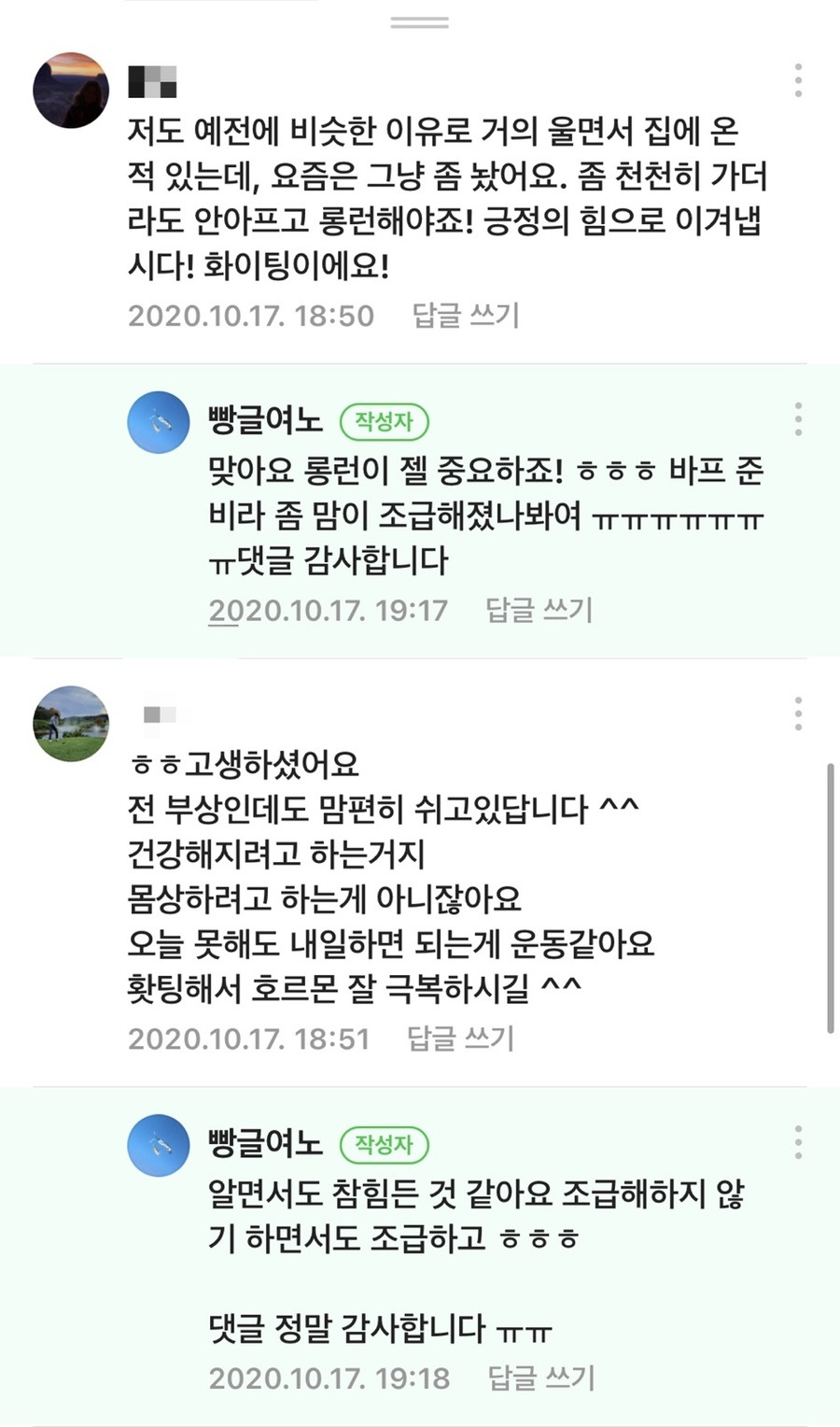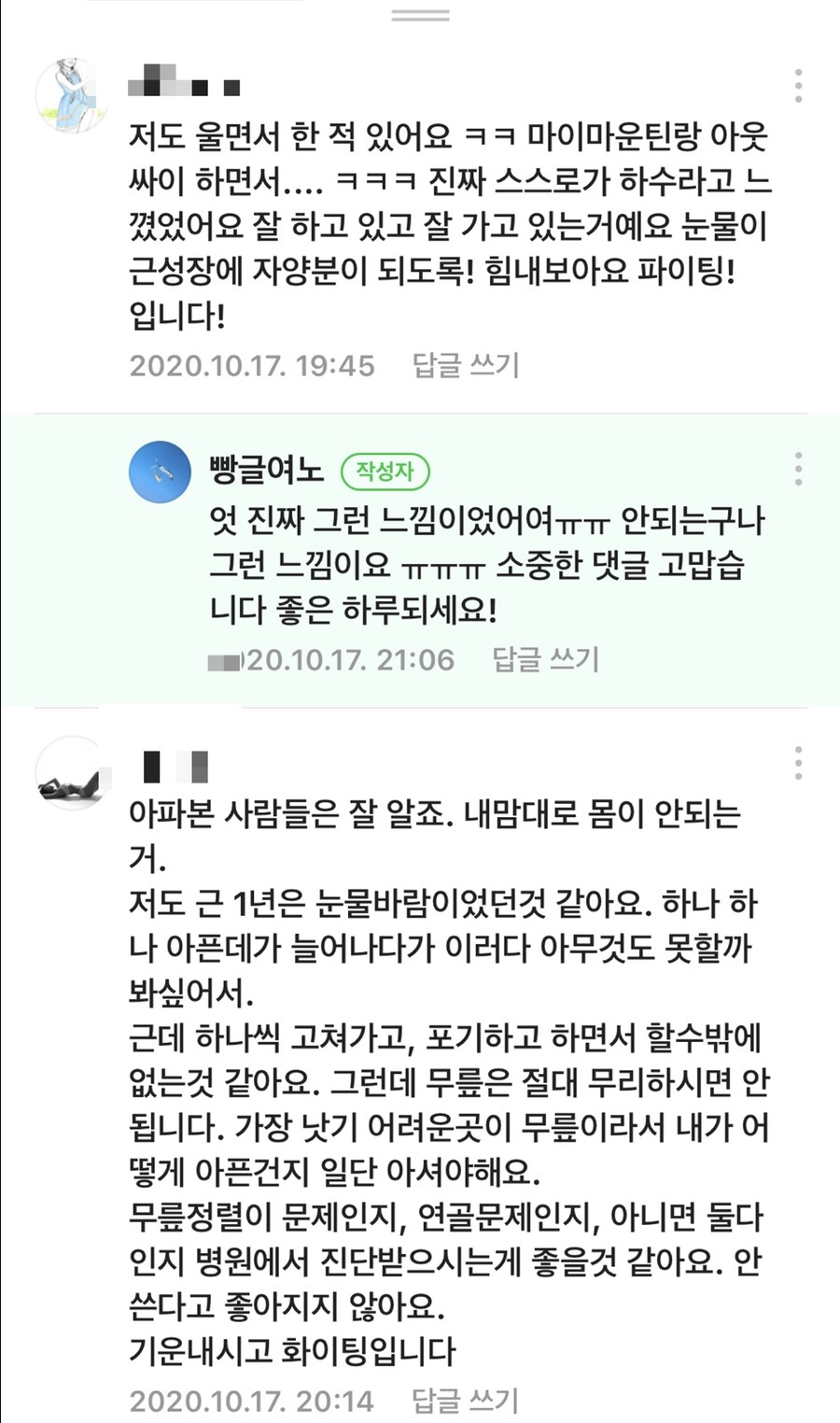 운동하다가 갑작스러운 우울함에 운 날, 카페에 절절하게 하소연했다. 지금 보니 엄청 부끄럽지만, 그때는 너무나 우울하고 힘들었다. 어이없이 운 것 같은데 카페 회원들은 공감해주며 댓글을 달아주었다.
