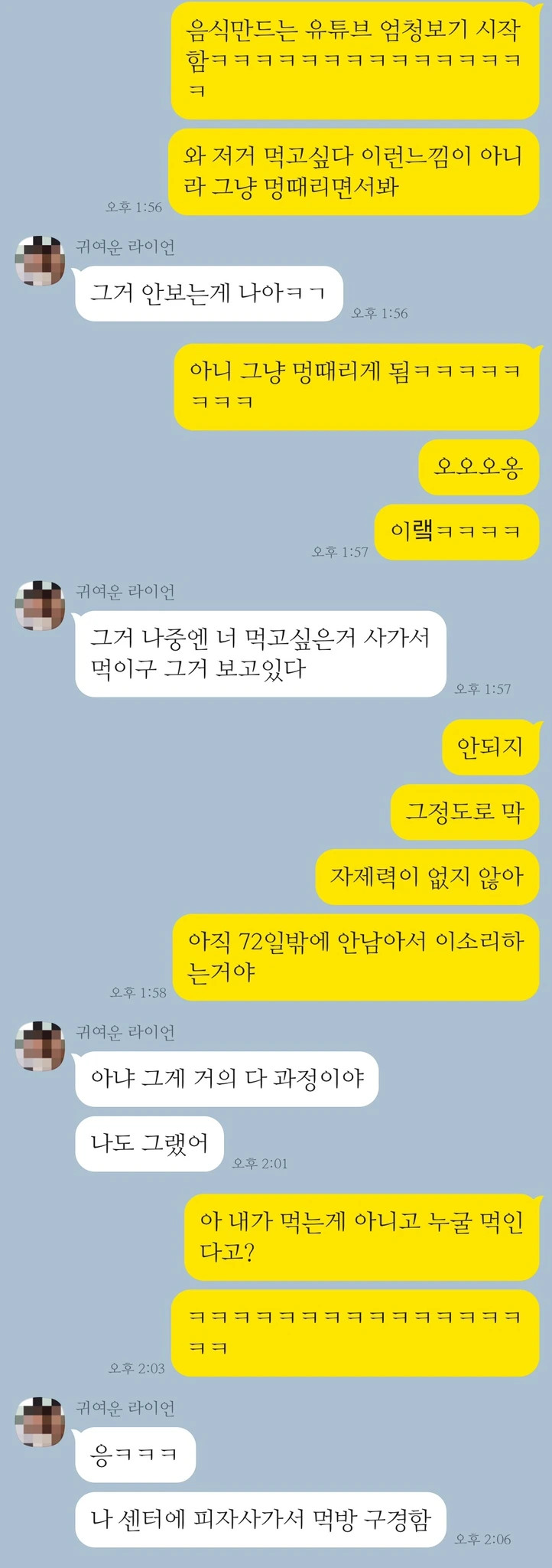 그리고 먹방을 보기 시작했다... 먹방을 왜 보는 건지 도대체 이해 안 갔는데 이제는 끼니 먹을 때마다 내가 먹방을 틀었다. 딱히 그들이 먹는 걸 먹고 싶은 건 아니었다. 그냥, 그냥 봤다.