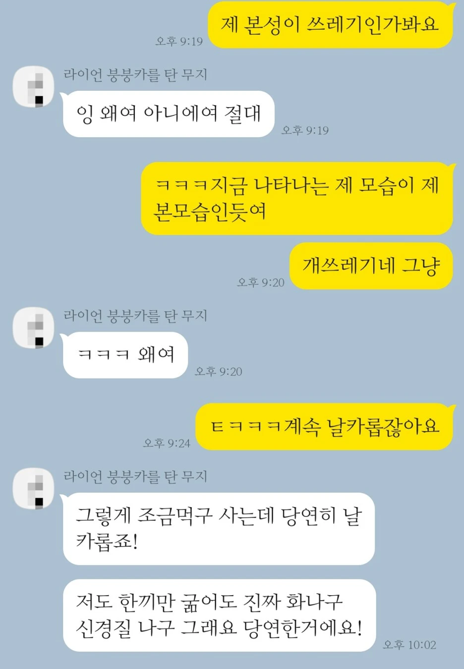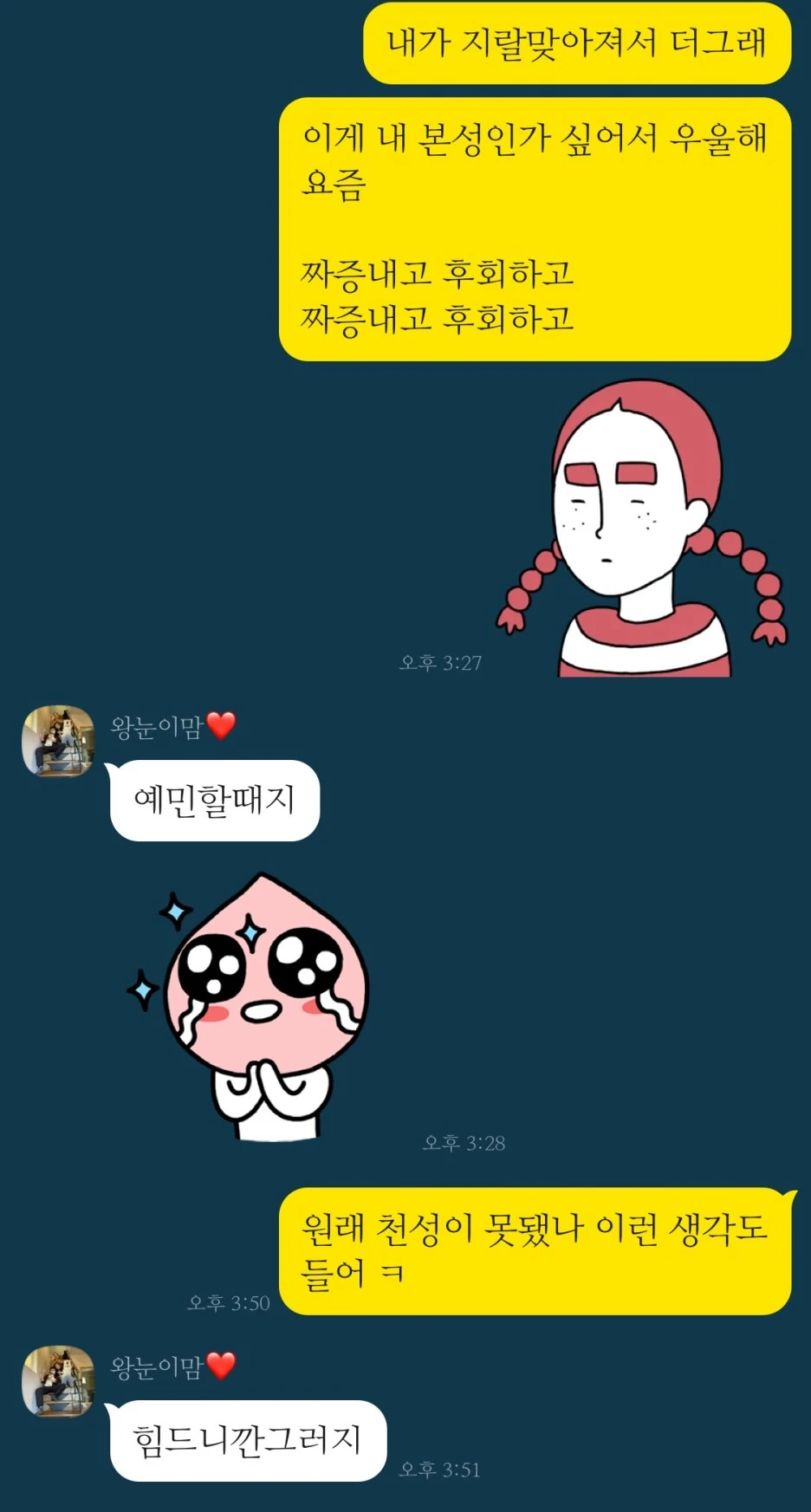 '뭐야 나, 왜 이렇게 인성이 개쓰레기야... 아무리 못 먹고 아무리 힘들어도 이렇게까지 남한테 상처를 주는 못돼 먹은 사람이었나? 누가 하라고 해서 하는 것도 아니고 내 선택으로 하는 건데, 도대체 왜 그러는 거야. 사실은 이게 진짜 내 본성 아닐까? 가장 힘들 때 본성이 나온다는데 난 정말 쓰레기 중에도 개쓰레기네...'