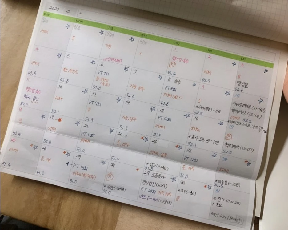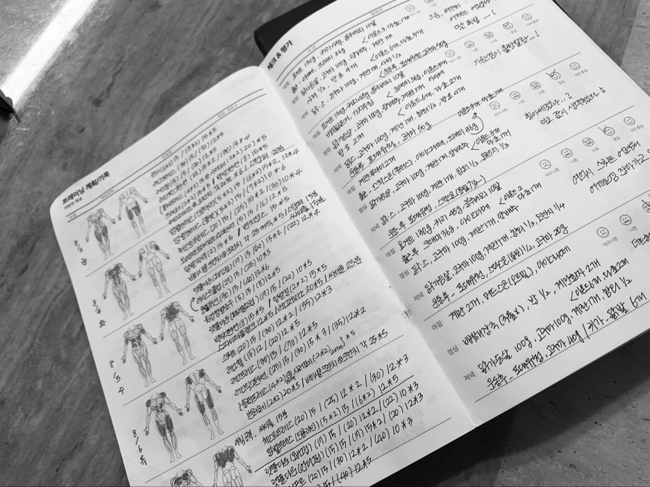 대부분 어플을 활용하여 식단과 운동을 기록한다. 확실히 어플로 기록하는 것이 편리하기도 하고 식단의 칼로리 계산, 탄단지 비율, 운동의 볼륨 등이 계산하기 편하다. 하지만 나는 수기로 적는 것을 워낙 좋아해서 수기로 적었다. 사각사각 수기로 쓰는 맛이 있다. 가득가득 공간을 채우는 즐거움도 있고.... 가득 채워서 공유하면 뭔가 해낸 느낌이라 좋았다.