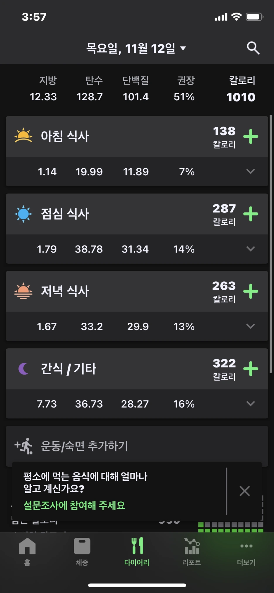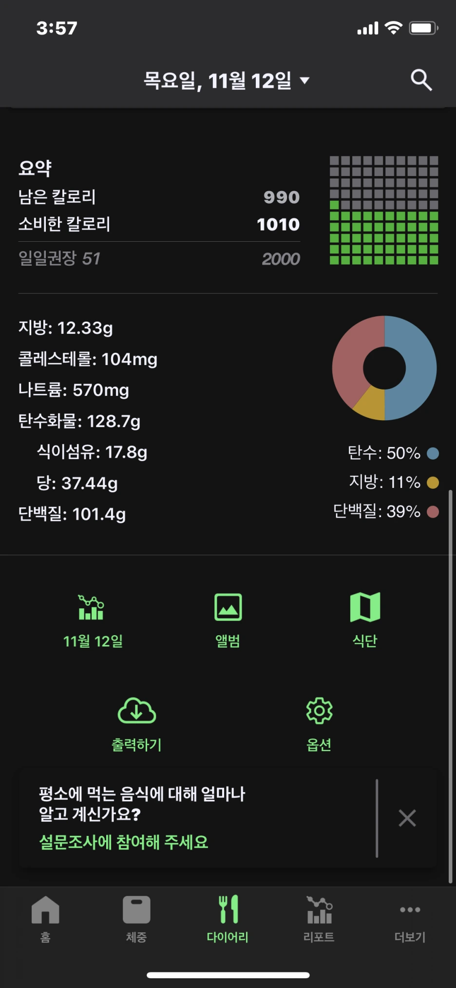 식단 기록 어플 Fat Secret은 나도 사용해봤다. 입력도 편리하고, 탄단지 비율도 계산이 잘 되어 지금도 종종 사용한다. 어플을 몇 번 쓰니.. 식단 일지를 수기로 쓰기가 귀찮아지더라... 확실히 신문물이 편하긴 하다.