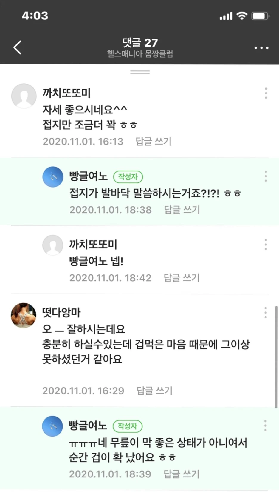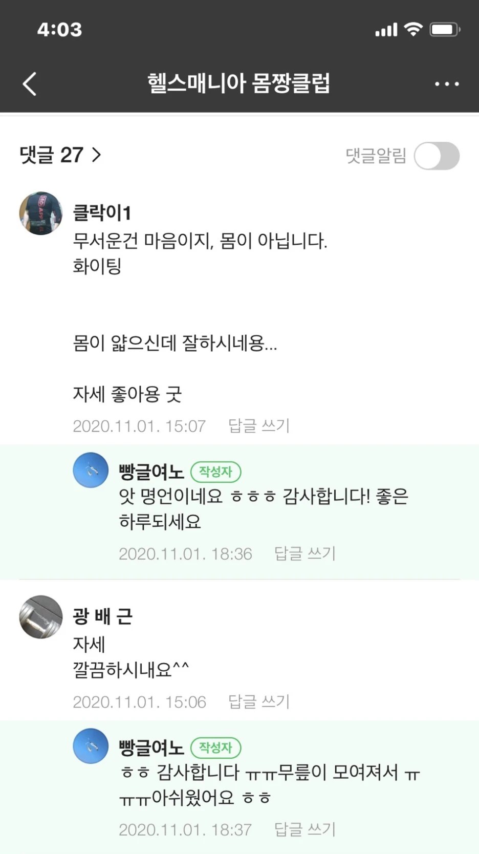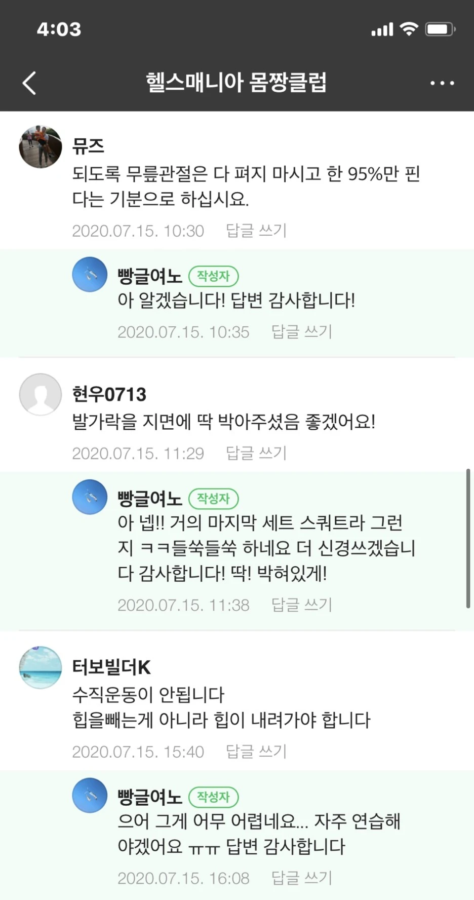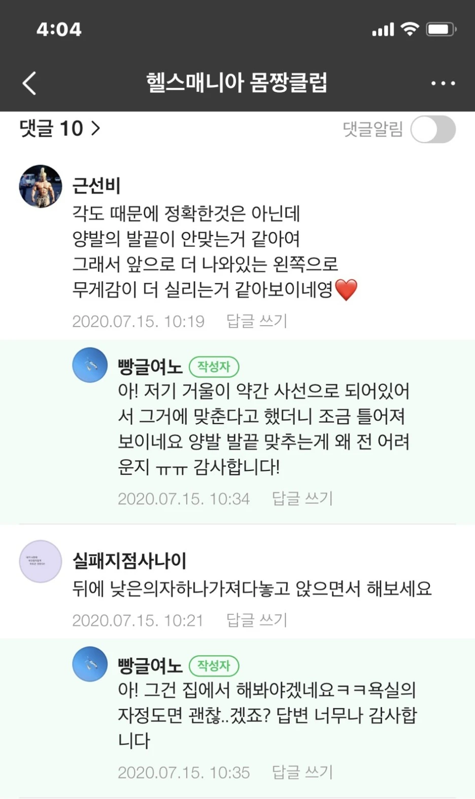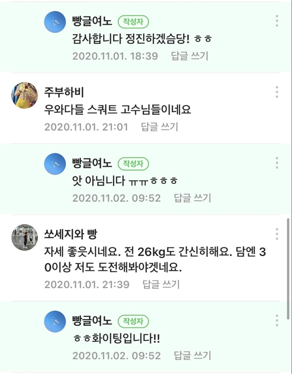 중량 스쿼트를 하면서는 더 신경 썼다. 아무래도 위험하니까, 처음부터 길을 잘 들여놓고 싶었다. 영상을 찍어 운동 잘하는 주변인들에게 물어보기도 하고, 헬매카페에 영상을 올려 조언을 얻기도 했다.
