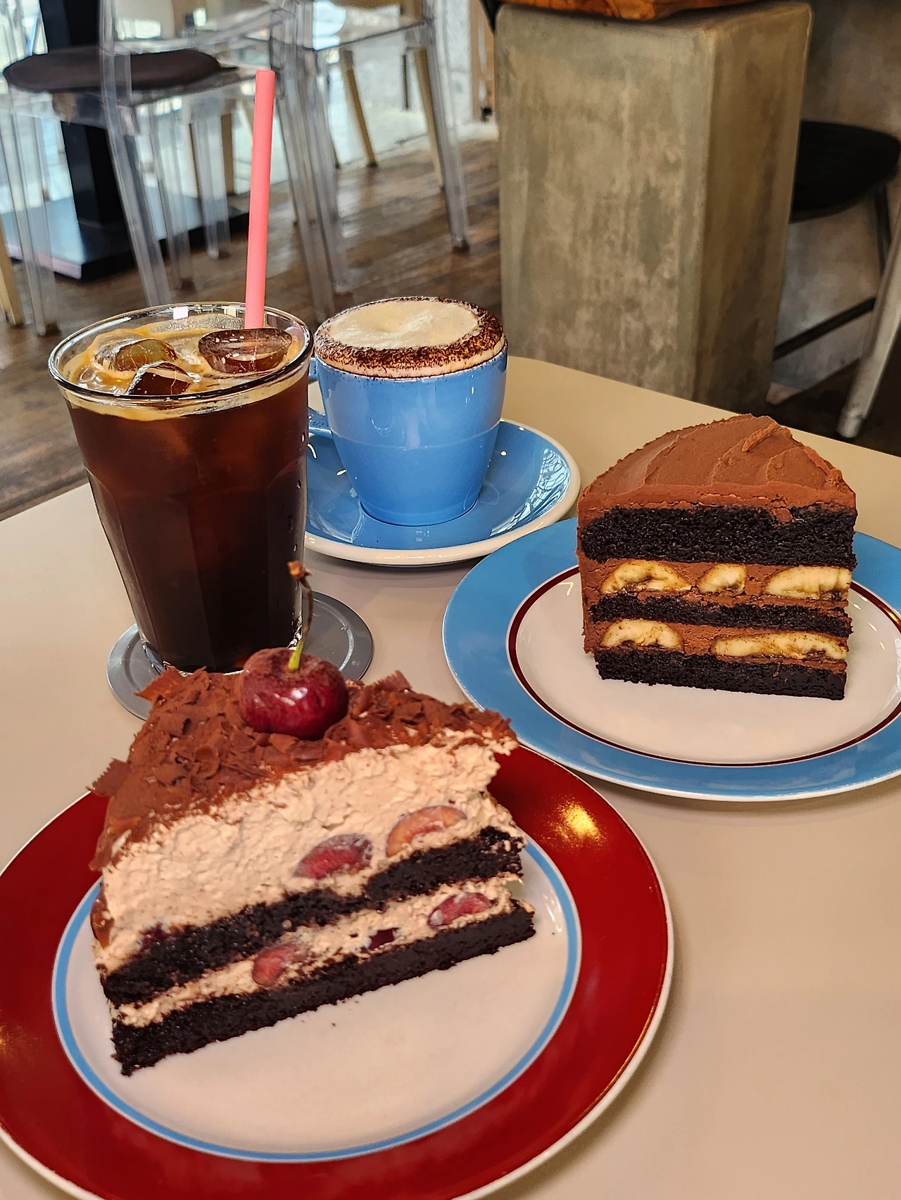 브라운슈가 방문 시 먹지 않으면 후회한다고 소문난 체리 포레누아는 필수 주문. 그리고 하나만 먹기 아쉬워 데블스 초코 바나나 케이크도 하나 더 주문하고 음료는 웜홀을 선택했다.