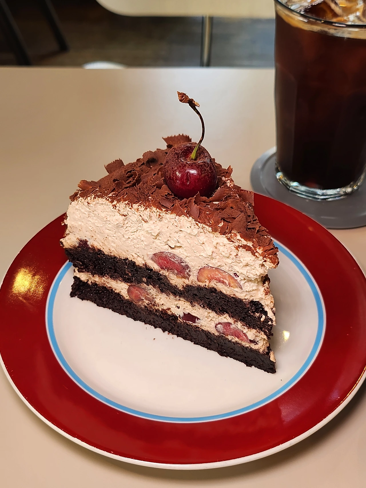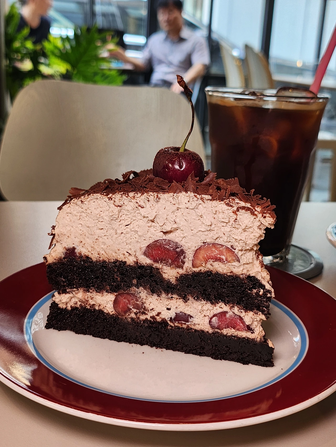 생크림은 좋은 걸 사용하는지 양에 비해 크게 물리거나 느끼하지 않고 우유풍미가 은은하게 느껴지면서 부드럽게 사르르 녹아내리는 맛이 인상 깊게 다가왔다. 체리는 중간에 톡톡 터지면서 케이크에 싱그러움을 더해준다.