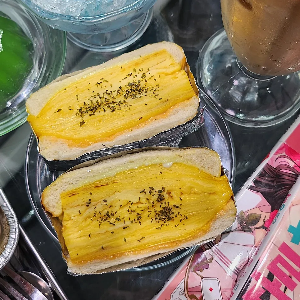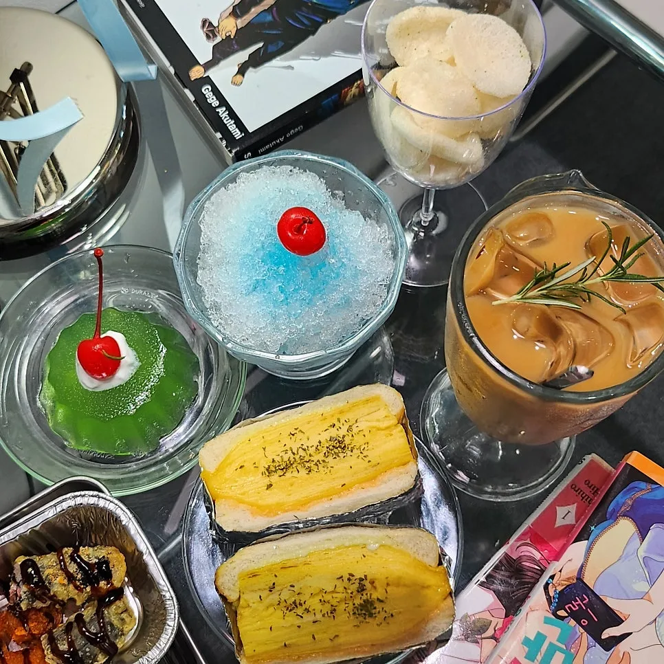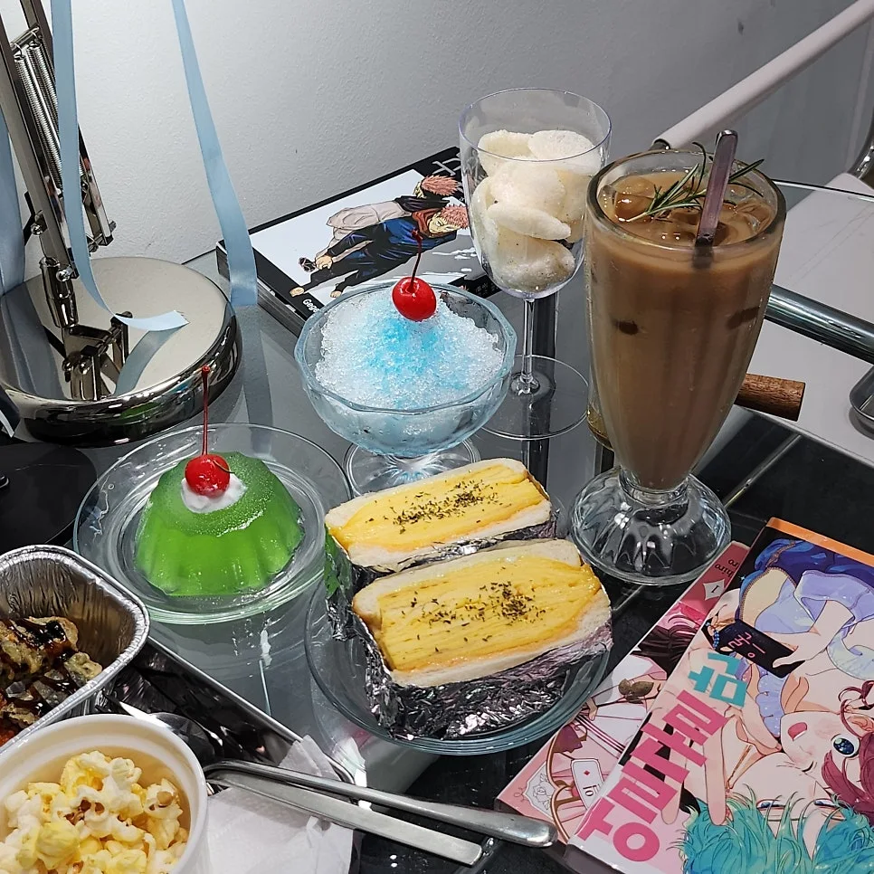 간단하게 먹고 싶어 난초라떼, 달걀산도(칠리맛) 딱 2가지만 주문했는데 갑자기 젤리푸딩이랑 얼음 빙수, 팝콘, 튀김, 과자까지 서비스로 계속 주셨다.