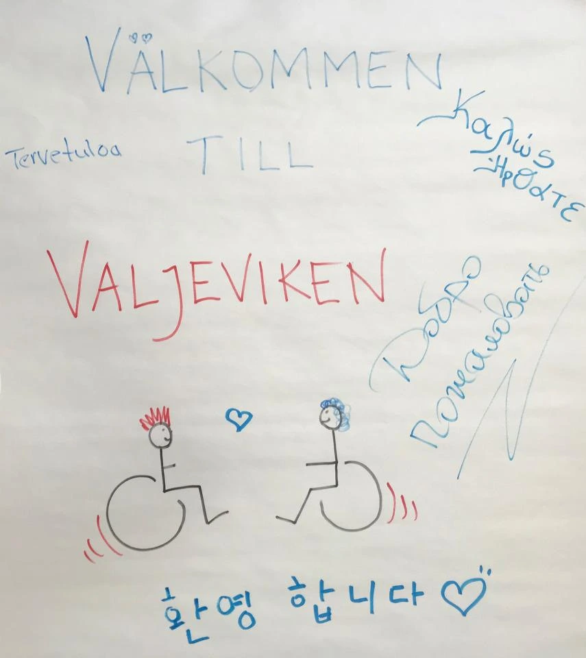 캠프가 시작되는 첫날. 안나와 나는 차로 1시간을 달려 Valjeviken에 도착했다. 이 곳은 재활병원, 스포츠시설, 숙박시설이 갖추어진 곳으로 휠체어로 모든 시설에 접근이 가능하도록 마련된 우리에게 편리한 곳이었다. 우리가 차에 내리니 미리부터 도착한 이 캠프에 리더들이 현관에서부터 참가자들을 반갑게 맞이하고 있다. 나와 같이 휠체어를 타고 있는 리더들이 아주 밝은 미소로 먼저 손을 내밀며 인사를 건넨다. 내 친구 안나에겐 스웨덴어로 인사를 하다가, 나를 보고는 영어로 이야기를 시작한다. 내가 스웨덴어를 못한다는 걸 미리 알고 있는 눈치다. 한두 명씩 새로운 얼굴들의 휠체어 탄 참가자들이 도착한다. 건강하고 기운 센 공기가 그곳에 흐르고 있었다. 이렇게 많은 휠체어 탄 사람들을 동시에 보는 것은 병원 다음으로 처음인 것 같았다. 총참가자가 몇 명인지 물으니 25명이란다. 그리고 리더는 26명. 그러니까 참가자 한 명 당 1명의 리더가 매칭 되어서 참가자가 끝까지 관리(?)가 될 수 있도록 한다. 그러니까 50대의 휠체어가 이 캠프장에 있는 것이다. 물론 자원활동 인력도 있다(이하 ‘자원’). 12명의 비장애인 자원은(스웨덴어로도 이들을 Resursperson라고 부른다.) 자원은 이 캠프에서 참가자와 리더들을 돕는 역할을 한다. 이곳에서는 걸어 다니는 사람이 소수의 인원이 되었다. 장애인을 보통 사회의 소수그룹 (Minority)이라고 여겨지곤 하는데, 이렇듯 상황이 역전되는 일도 가끔씩 있다.