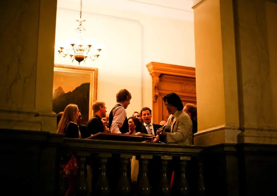 징징(맨왼쪽), 지에지에, 휘트니, 제인 그리고 기타를 든 나. 펑요우를 부르기 전에 지에지에가 한마디하고 있다마침 그때 싸이의 '강남 스타일'이 스웨덴에서도 꽤 알려지기 시작할 때라 펑요우를 함께 부른 뒤에 나는 강남스타일을 1절만 부르며 5분이란 시간을 지켰다.