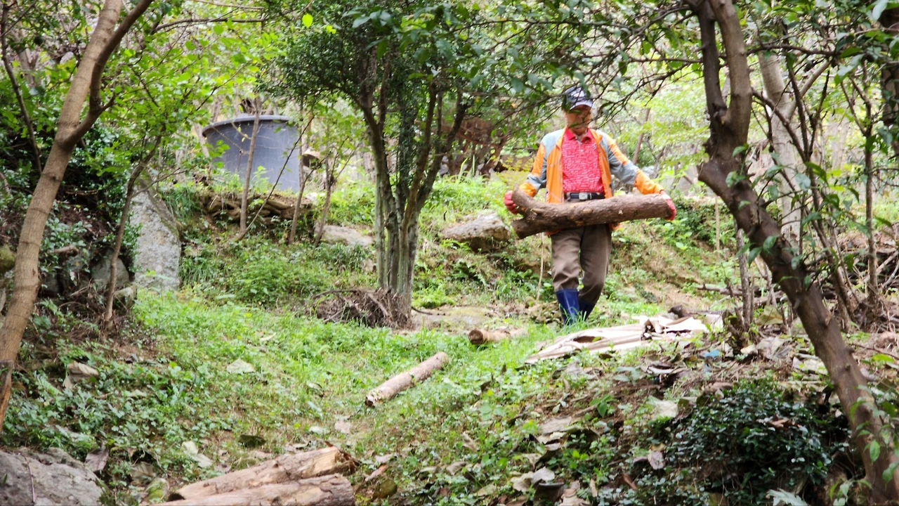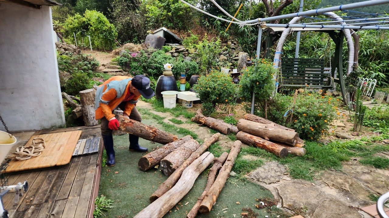 톱질을 하기 위해 나무를 정리하는 아버지