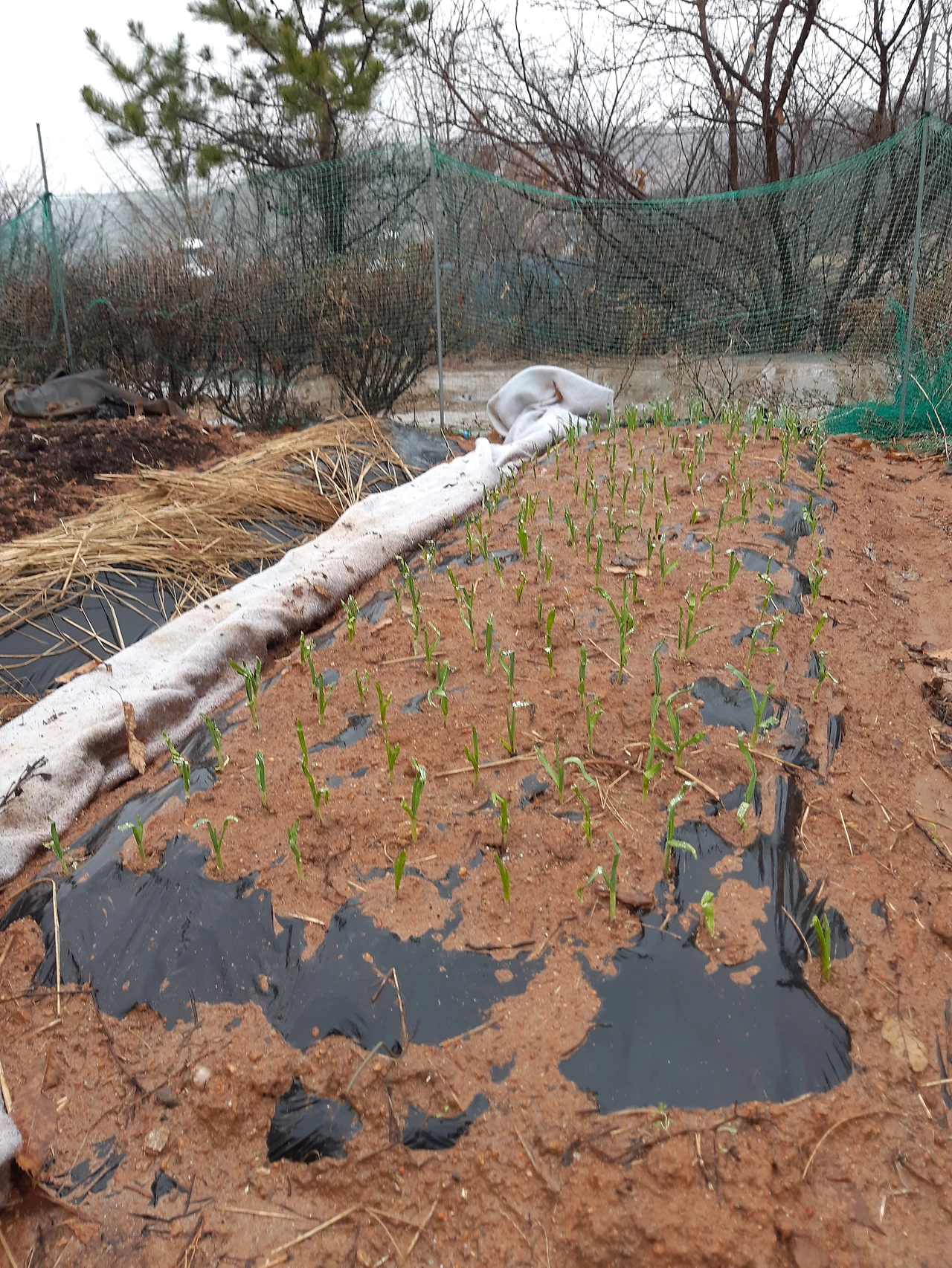 이렇게 만든 밭에 양파와 마늘이 겨울을 잘 이겨내고 봄비를 맞고 있다.