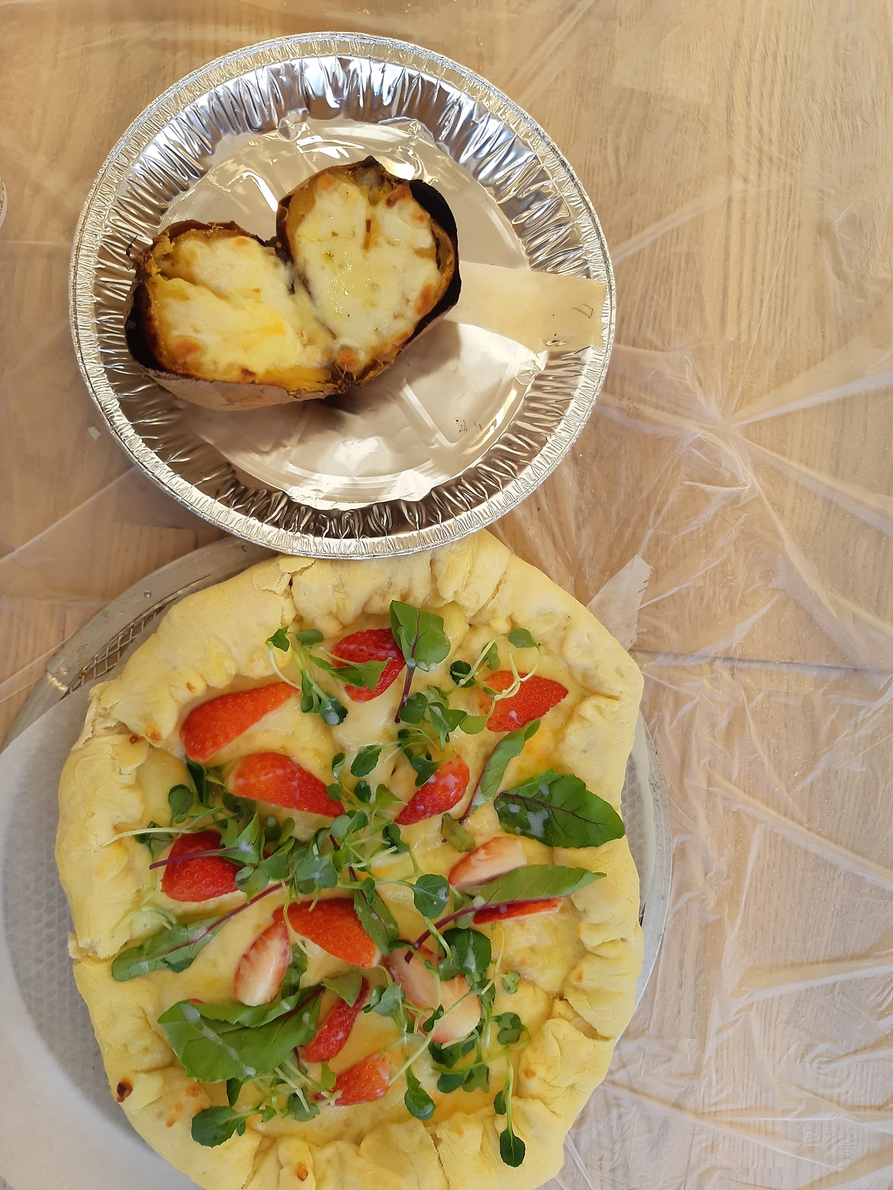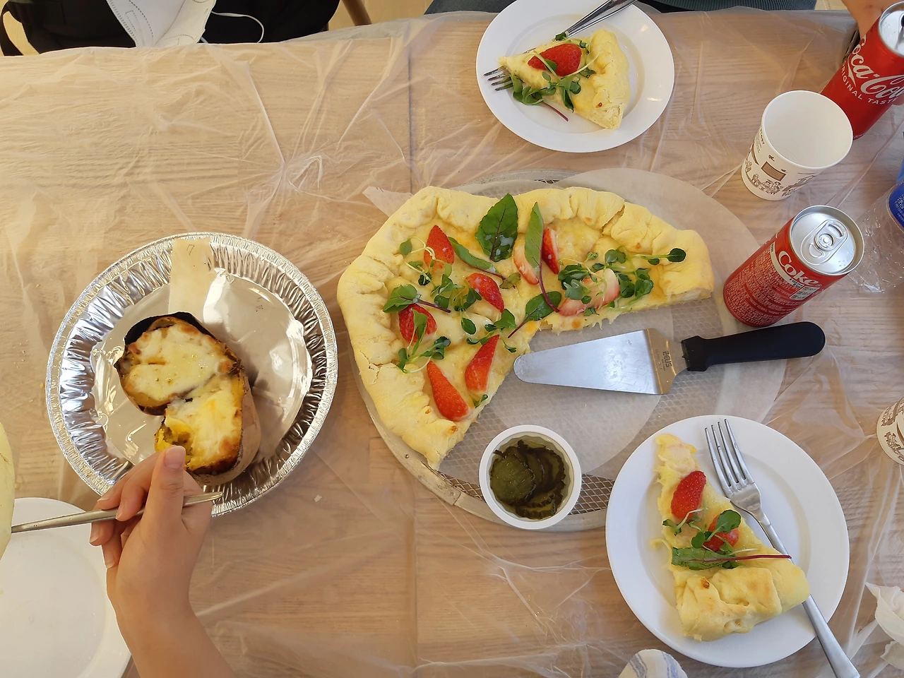 "피자 만들어서 먹고 고구마랑 딸기도 준데."