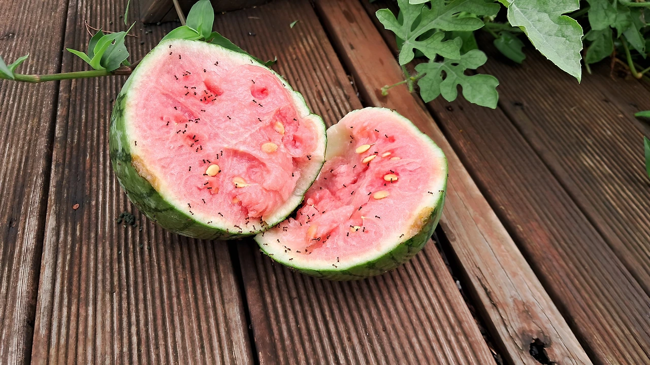 수박은 작년부터 복수박을 심는다. 모종 판매 사장님이 참외처럼 순을 지르면 된다고 해서 심기 시작했다. 복수박이 껍질까지 먹을 수 있어서 좋다. 매번 수박을 잘 키워놓고 따는 시기를 놓쳐서 못 먹는 것이 많았다. 올 해도 출근하면서 수박을 살펴보고 '퇴근할 때 따야지.' 했던 수박이 갑자기 온 비를 맞고 놀라서 쪼개졌다. 잘라보니 개미들이 시식을 먼저 시작했다. 아깝지만 다 같이 먹고살아야지. 옆에 수박을 따서 쪼개 보니 잘 익었다.