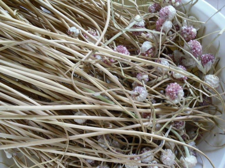 마늘종을 뽑지 않으면 그 끝에 작은 마늘이 추가로 생긴다. 그것을 마늘 주아(씨앗)라고 한다. 마늘을 심을 때 한쪽에 마늘 주아를 모아서 따로 심으면 통마늘(쪽이 나지 않는 마늘)이 된다. 그 통마늘을 다시 심으면 정상적인 육쪽마늘이 되는 것이다. 마늘 주아를 심는 이유는 좋은 씨마늘을 얻기 위해서다. 같은 종류의 마늘을 계속 심다 보면 병충해에도 약하고 크기도 작아진다. 닭도 자연 부화를 계속하다 보면 근친 교배가 되어서 좋지 않다고 해서 부화시기에 계란을 바꿔주기도 하는데 식물이나 비슷하다. 대량 생산하는 분들은 씨마늘을 구매해서 사용하시겠지만 씨마늘 값을 아끼기 위해서 시골에서는 아직도 이런 식으로 농사를 짓는다. 나도 그렇게 한다.