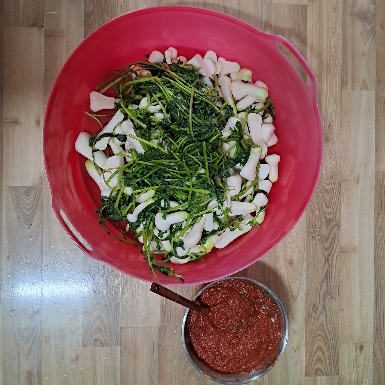 나는 아들을 불러서 다 씻은 무를 들고 집안으로 들어왔다. 10년 넘게 간수를 뺀 천일염을 물에 타고 무청을 제외한 무부분만 먼저 소금물에 걸치듯이 담갔다. 그 사이에 샤워를 하고 나와서 무청을 마저 집어넣었다. 절여지는 동안 양념을 만들었다.집에 있는 양파와 과일, 새우젓이랑 액젓도 넣고 쌀밥도 함께 휘휘 갈았다. 고춧가루에 마늘, 생강도 넣고 매실청도 첨가하면서 간을 맞췄다. 밭에서 바로 뽑아 온 대파도 썰어 넣었다. 사실 간만 맞으면 맛있는 것이 총각김치라고 생각해서 딱히 신경을 많이 써서 담그지 않아도 익고 나면 다 맛있다. 물론 내 입맛이 그렇게 평가한 것이다.