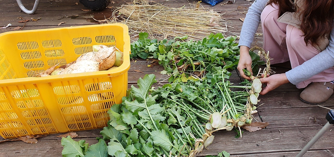 온 가족이 함께 텃밭을 정리하고 먹거리를 챙기는 주말을 마무리한다. 오늘 저녁은 삼겹살에 가을 냉이 무침과 배추 우거지 된장국이 차려진다.