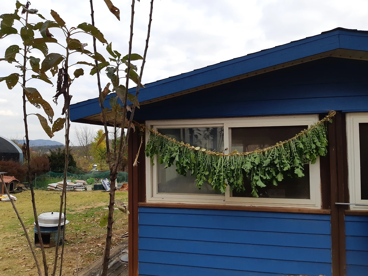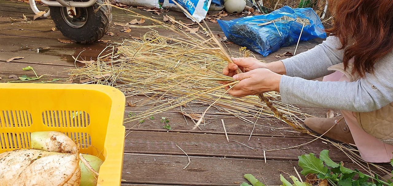 그리고 이제 무를 뽑아야 한다. 김장에 넣을 무를 뽑아서 무와 줄기를 분리한다. 줄기는 흩어지지 않게 무 밑동이 남도록 잘라준다. 그래야 새끼에 꽂아서 처마 밑에 걸기가 좋다. 이렇게 말린 무청은 겨울이 지날 때까지 먹을 수 있다.