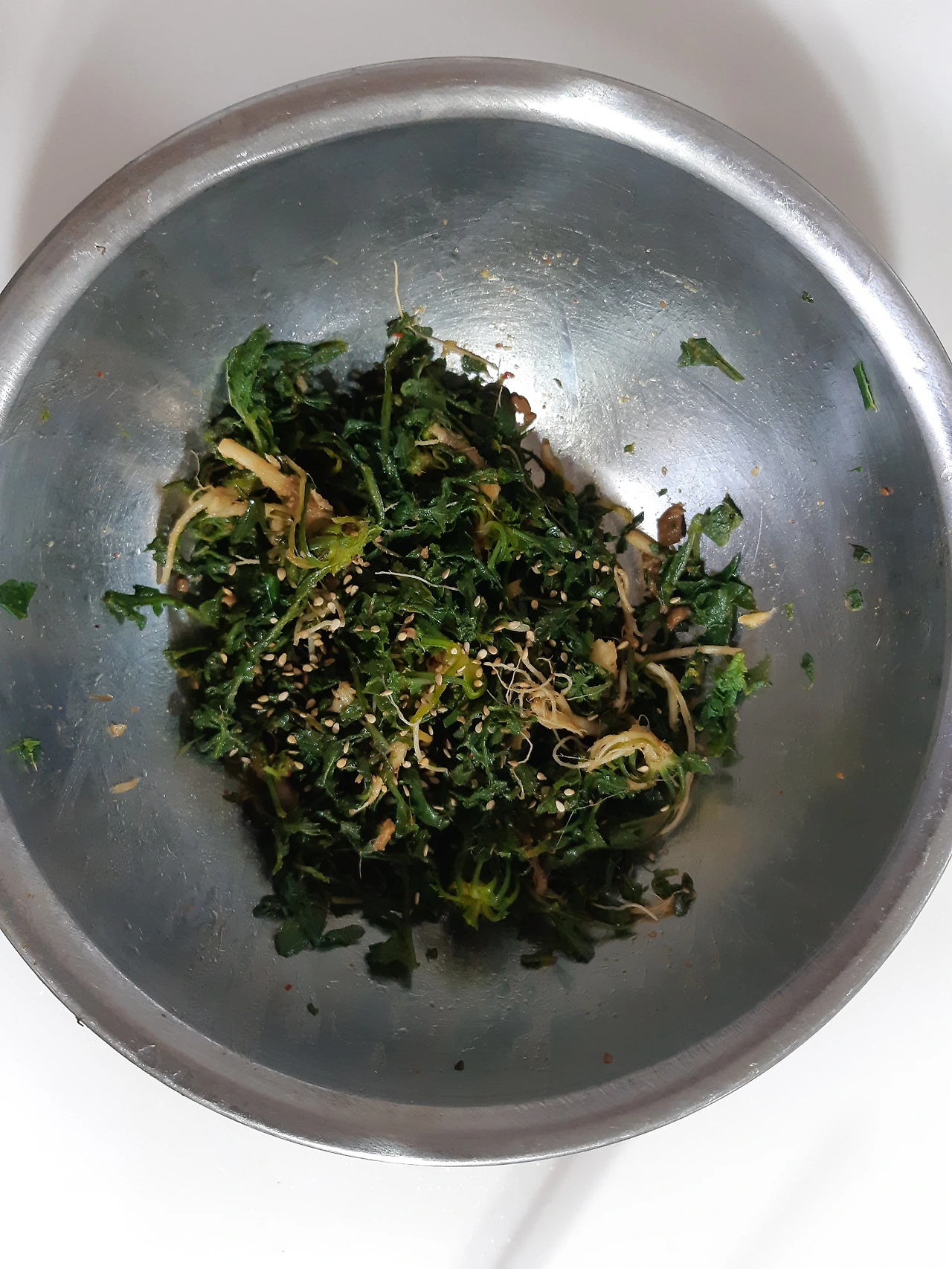 이제 앉아서 새끼를 꼬면 된다. 친정 논에서 챙겨 온 짚단을 풀어서 한 움큼 집어 들고 바닥에 탁탁 쳐서 정리를 한다. 한 가닥을 잡아서 전체를 돌려 묶어주고 두 줄로 나눈다. 손을 비벼서 새끼줄을 꼰다. 가끔 침을 '퇴퇴' 뱉어줘야 하지만 썩 맘에 들 지 않는 행동이다. 손이 건조하면 잘 비벼지지 않기 때문에 꼬기가 힘들어서 하는 행동이다. 처마 밑에 걸 만큼 새끼가 꼬아지면 무청을 새끼줄 사이에 엮는다. 새끼 꼬기는 예전 어릴 때 담배를 엮기 위해서 꼬았던 실력을 발휘한다. 이렇게 새끼줄에 엮어서 걸어 말리던지 살짝 데쳐서 냉동실에 넣었다가 해동해서 먹을 때 껍질을 까서 된장과 복아 먹는다.