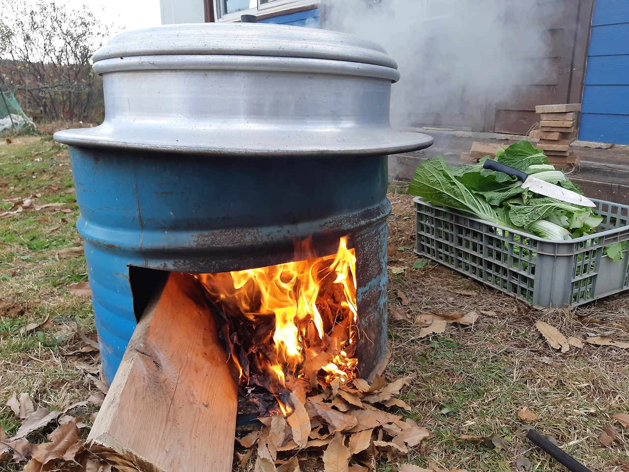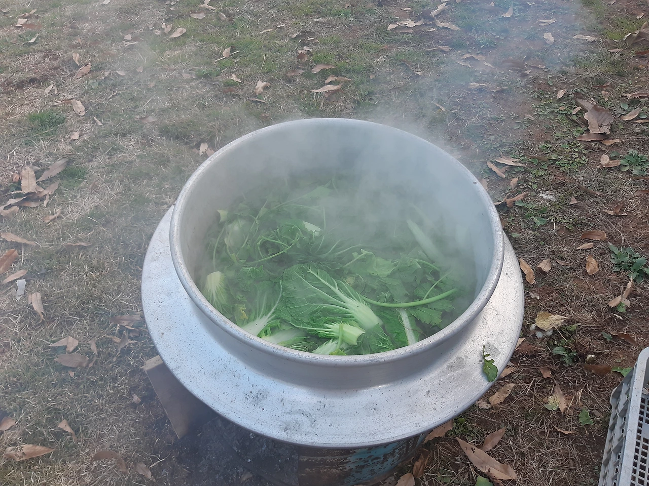 오늘은 늦게 심어서 아직 속이 덜 찬 배추도 뽑았다. 계속 밭에 둔다고 속이 차지 않는다. 겉잎은 닭에게 던져준다. 무청 남은 것과 배추를 함께 정리해서 삶을 준비를 한다. 솥에 물을 채우고 집 뒤뜰에서 떨어진 상수리 나뭇잎을 긁어모은다. 큰 아들이 긁어모으고 막내딸이 담아서 나른다. 나는 불을 지핀다. 연기가 나자 남편은 공기 오염시킨다고 질색을 한다.