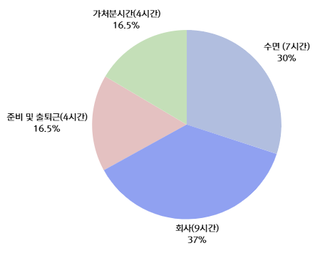 제 경우에 하루일과를 간략하게 정리해 보면 오롯이 제게 주어지는 시간은 고작 한두 시간 남짓이었습니다. 야근이라도 하는 날엔 그마저도 없었고요. 4시간의 가처분 시간 안에는 밥 먹는 시간, 집안일하는 시간까지 포함되어 있거든요. 건강관리를 위해 운동이라도 하나 시작하려면 자는 시간을 줄여야 하는 상황입니다.