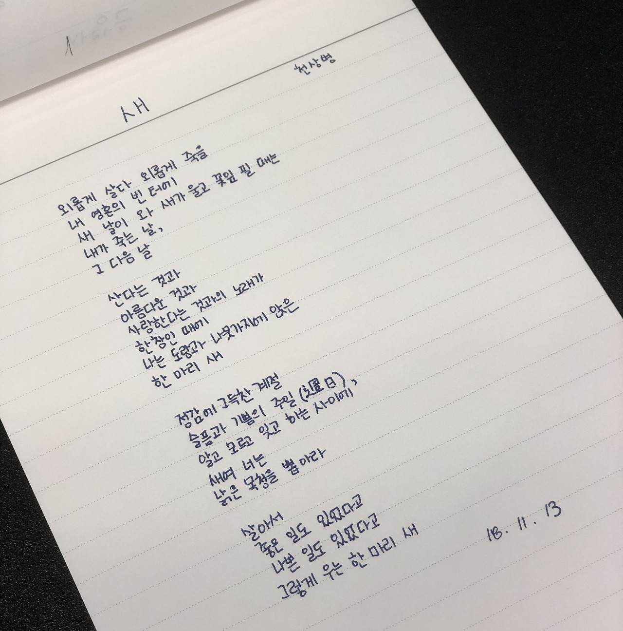 외롭게 살다 외롭게 죽을 내 영혼의 빈 터에 새 날이 와 새가 울고 꽃잎 필 때는 내가 죽는 날, 그 다음 날 산다는 것과 아름다운 것과 사랑한다는 것과의 노래가 한창인 때에 나는 도랑과 나뭇가지에 앉은 한 마리 새 정감에 그득찬 계절 슬픔과 기쁨의 주일(週日), 알고 모르고 잊고 하는 사이에 새여 너는 낡은 목청을 뽑아라 살아서 좋은 일도 있었다고 나쁜 일도 있었다고 그렇게 우는 한 마리 새