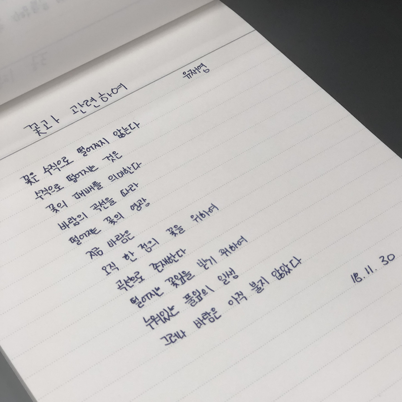 꽃은 수직으로 떨어지지 않는다수직으로 떨어지는 것은꽃의 패배를 의미한다바람의 곡선을 따라떨어지는 꽃의 영광지금 바람은오직 한 점의 꽃을 위하여곡선으로 존재한다떨어지는 꽃잎을 받기 위하여누워 있는 풀잎의 일생그러나 바람은 아직 불지 않았다